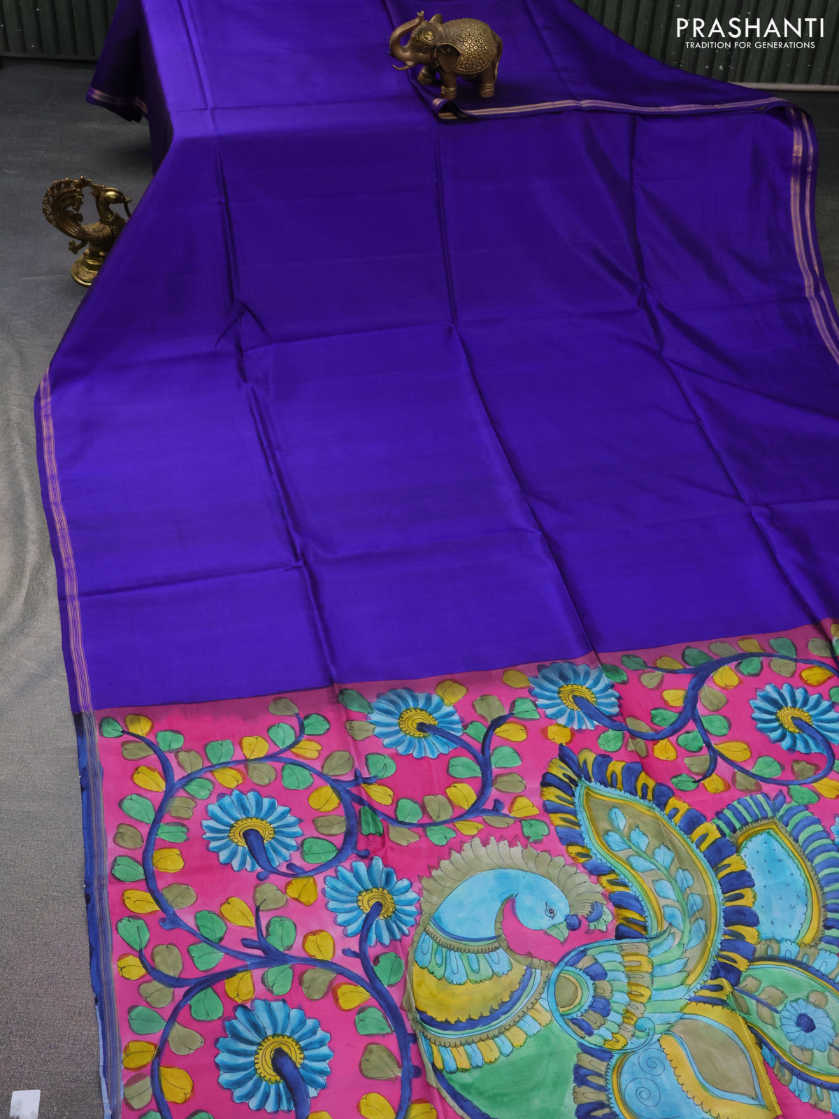 Pure soft silk saree blue and magenta pink with plain body and hand painted kalamkari printed pallu