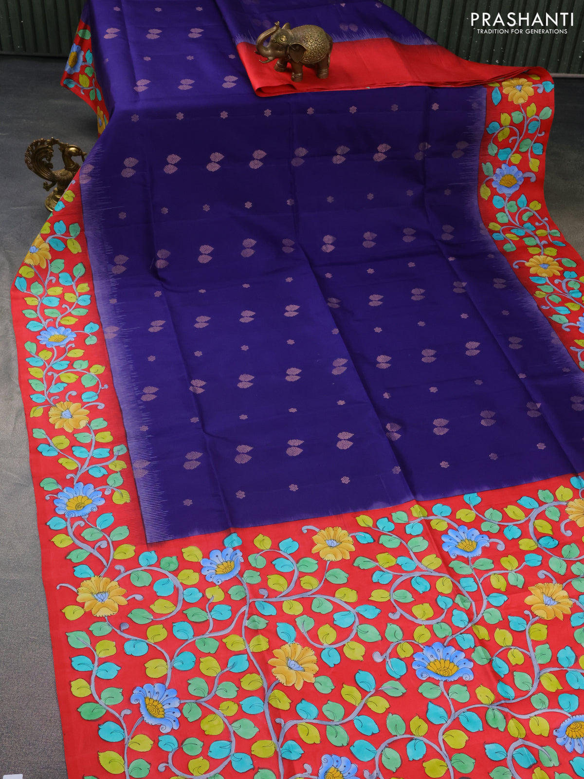 Pure soft silk saree dark blue and red with zari woven buttas and hand painted kalamkari pallu