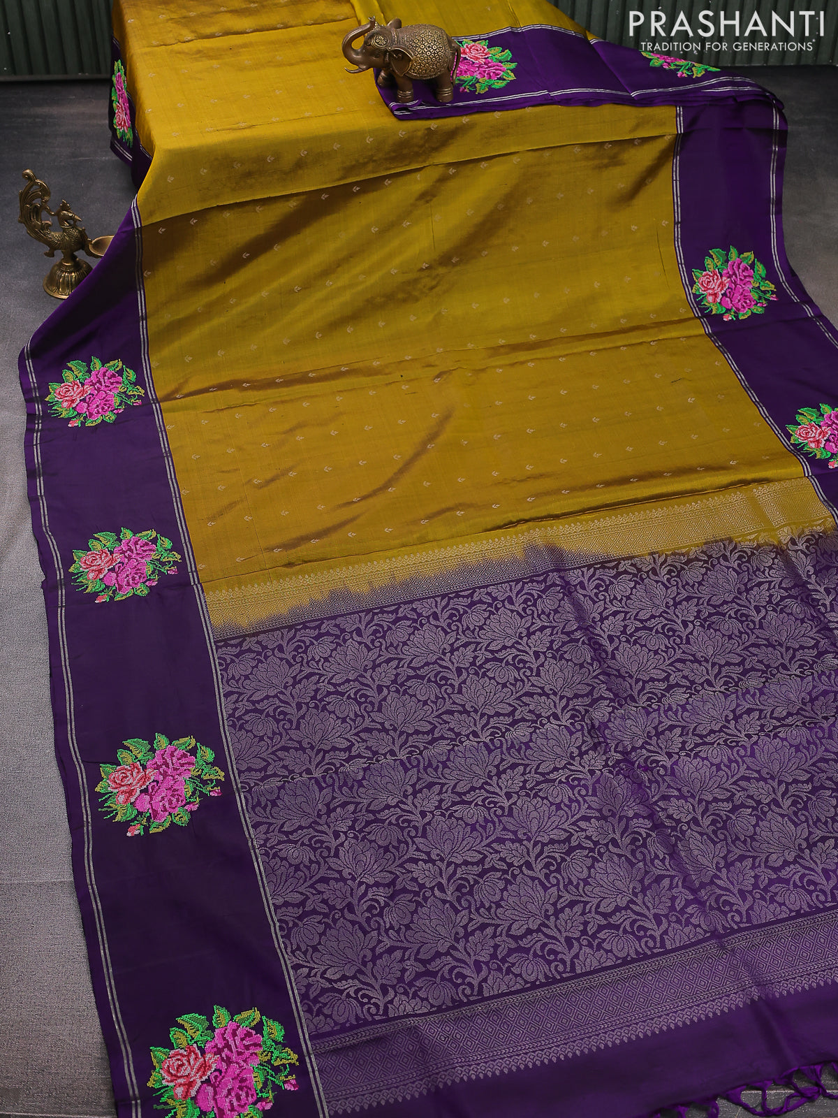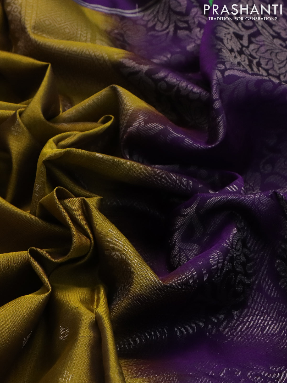 Pure soft silk saree dark mustard and violet with allover silver zari woven butta weaves and zari woven embroidery butta border