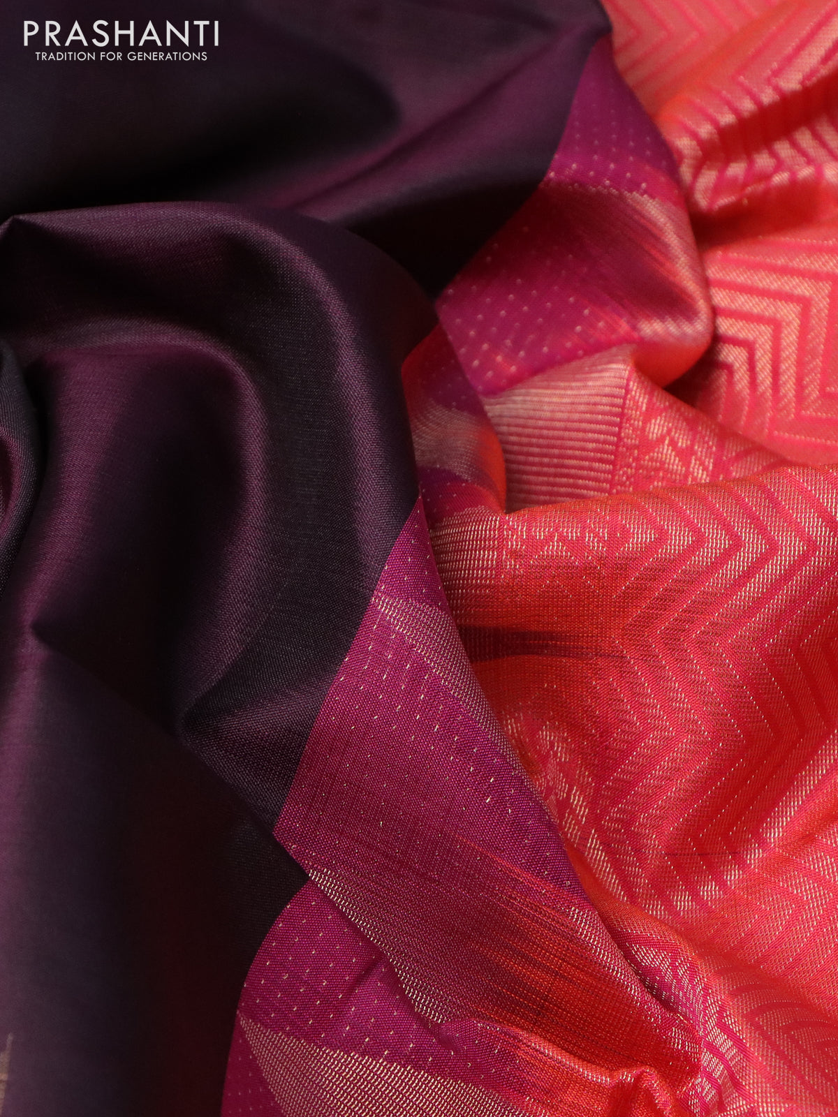 Pure soft silk saree deep jamun and dual shade of pinkish orange with zari woven muniya buttas and temple design zari woven border