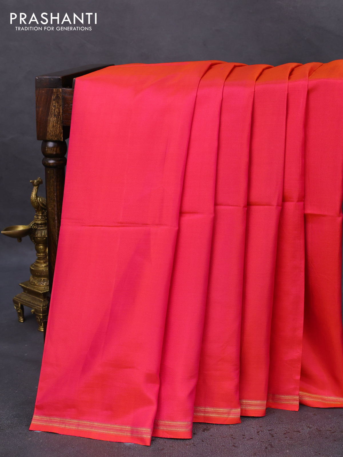 Pure soft silk saree dual shade of pinkish orange and pastel green with plain body and hand painted kalamkari printed pallu