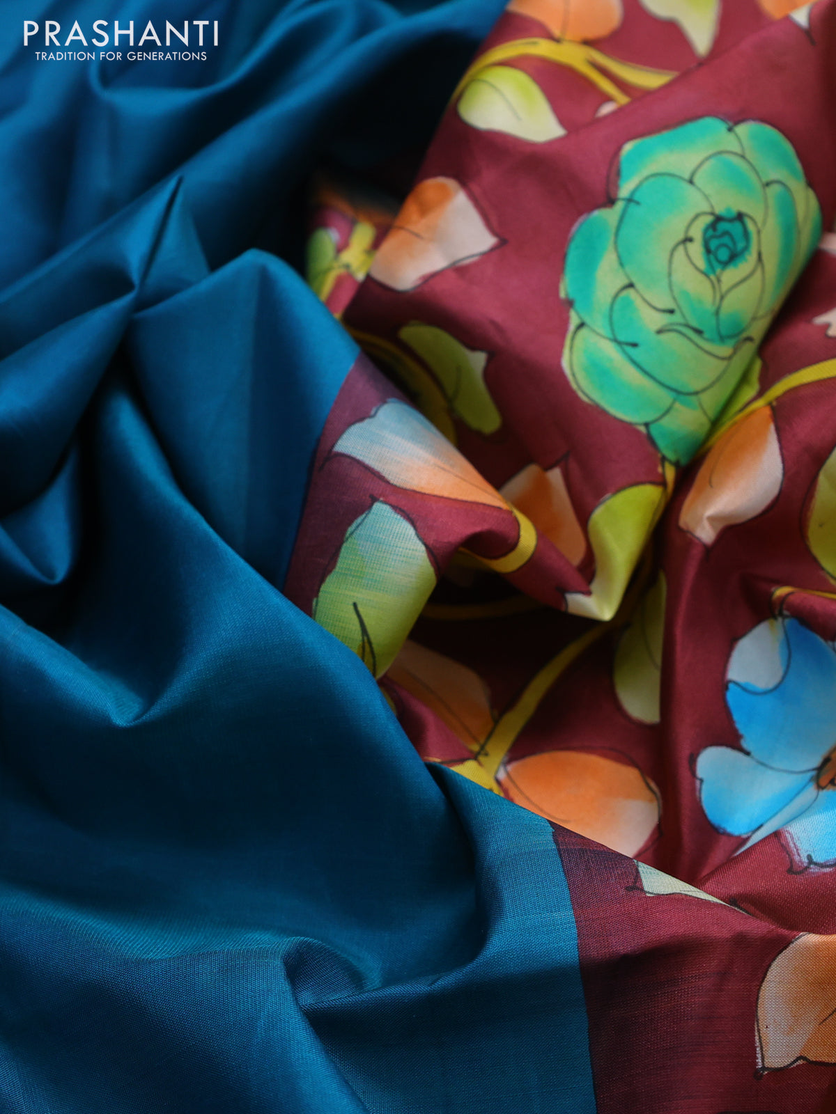 Pure soft silk saree dual shade of teal and maroon with plain body and hand painted kalamkari pallu