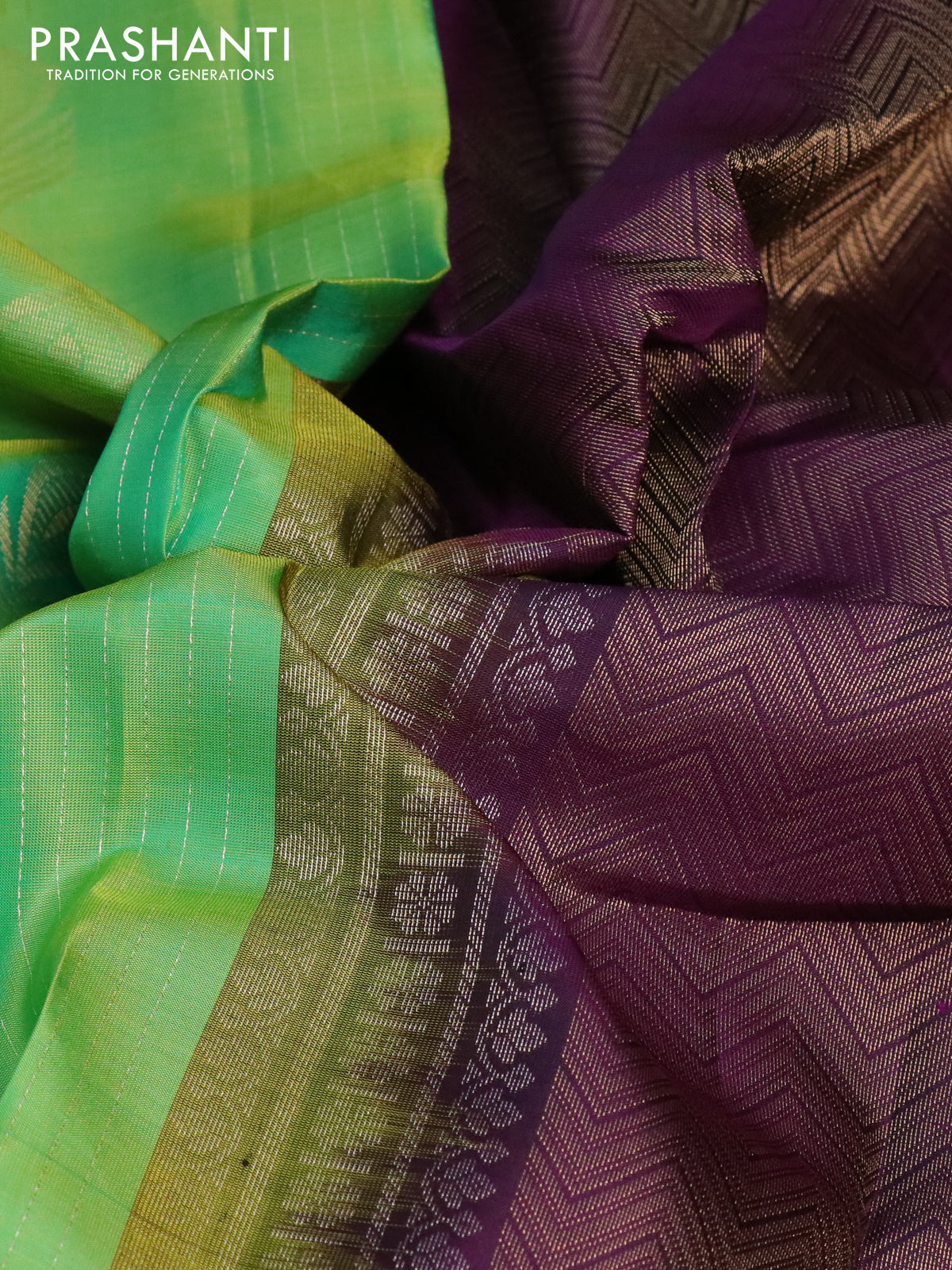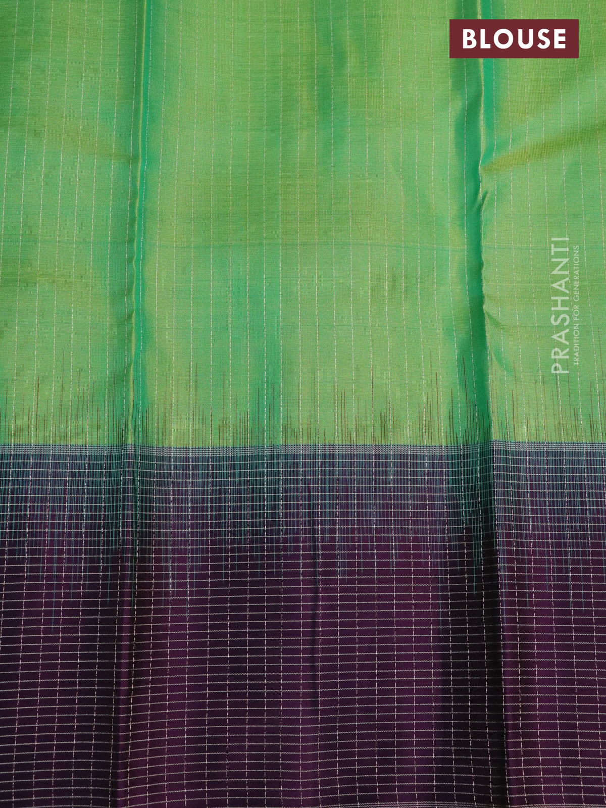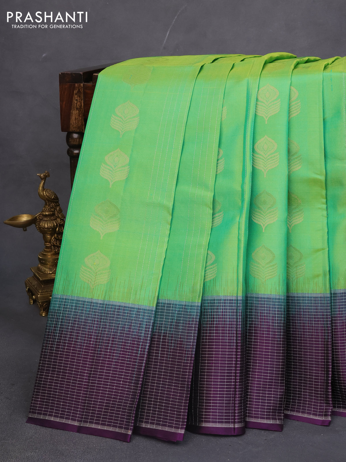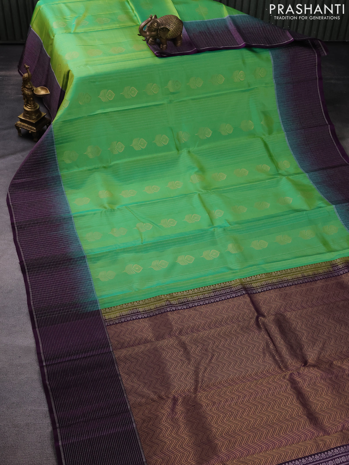 Pure soft silk saree green and dark purple with allover zari stripe & buttas and silver zari woven checked border