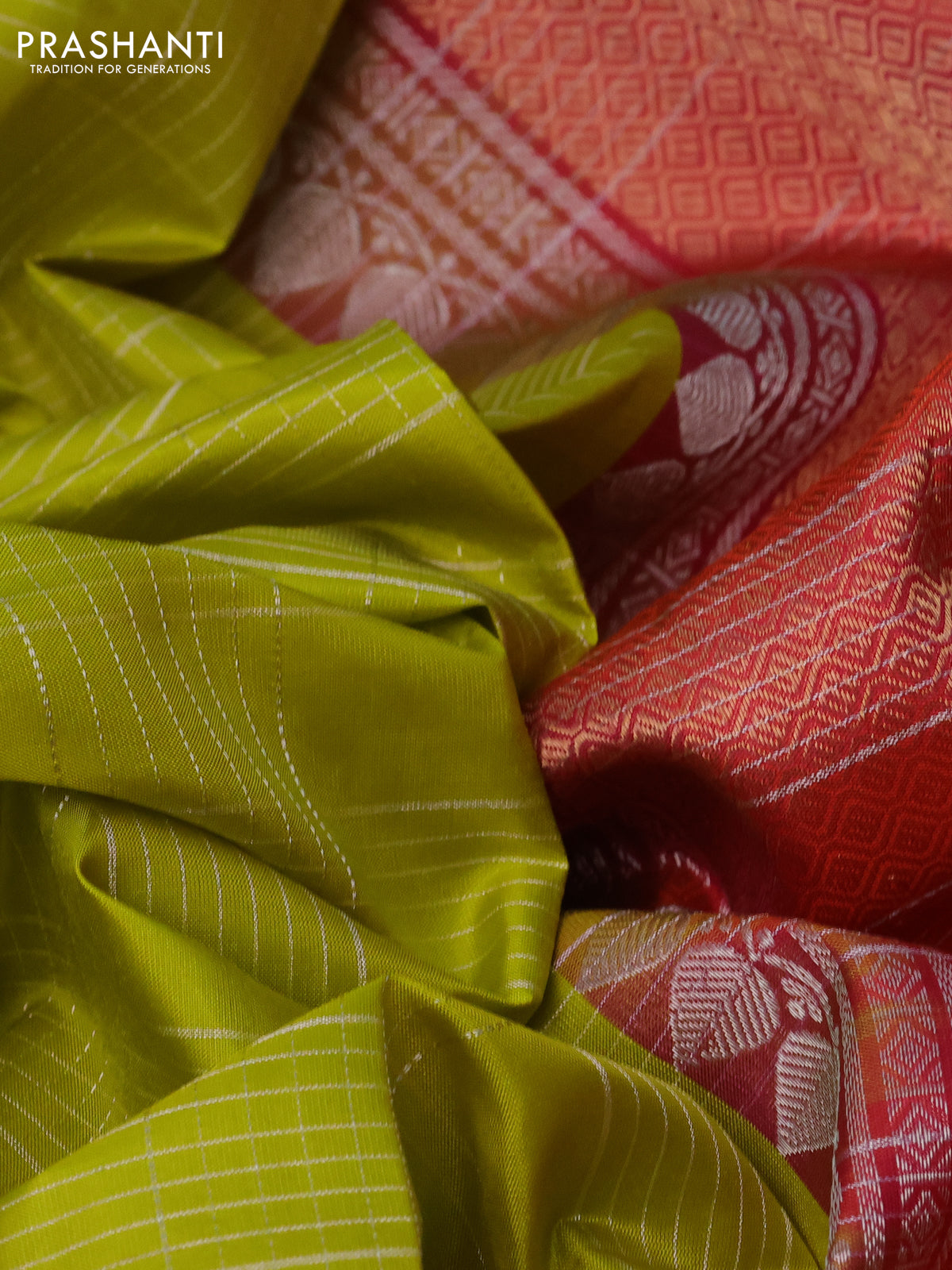 Pure soft silk saree lime green and dual shade of pink with allover silver zari checked pattern and zari woven butta border