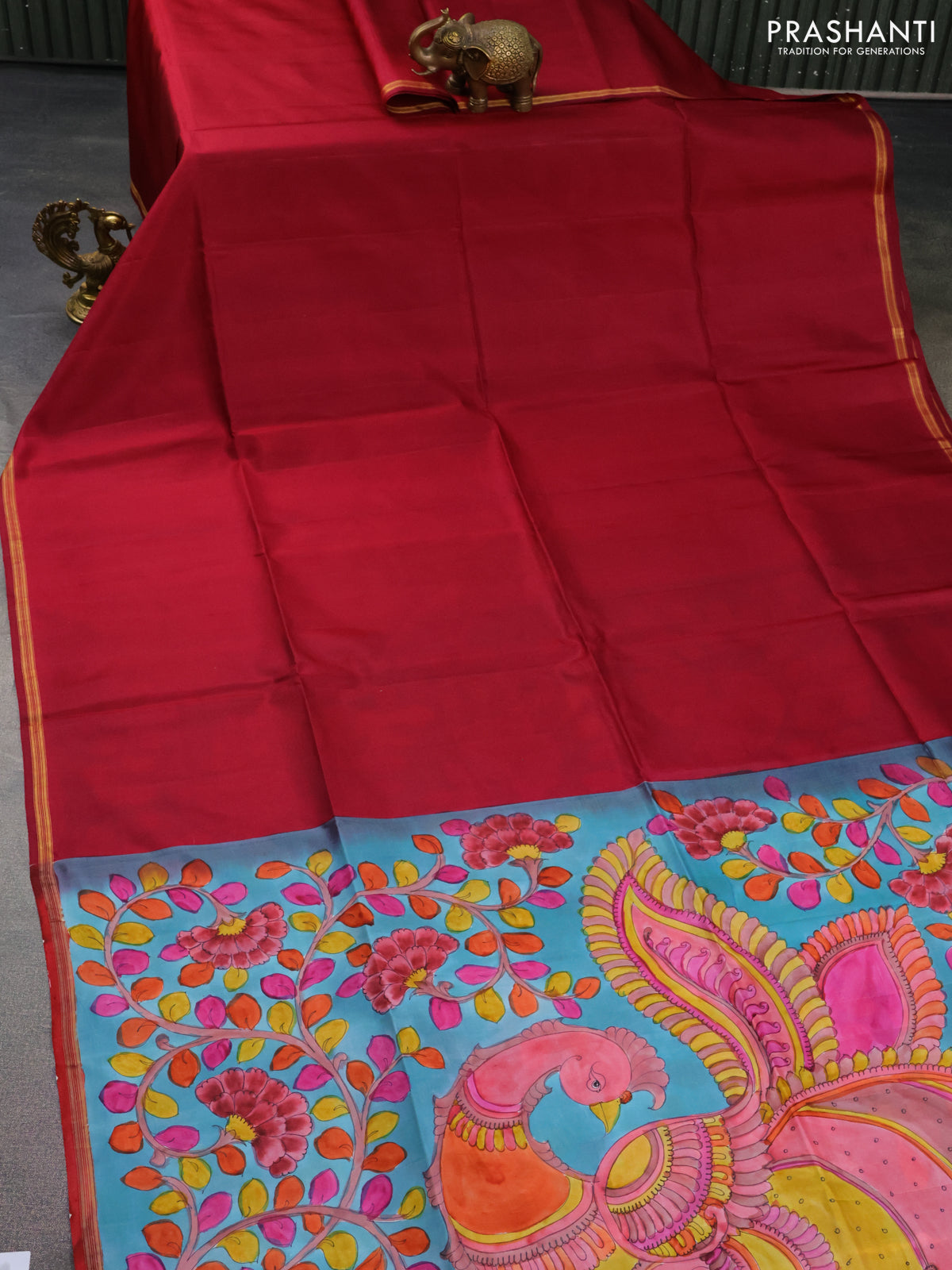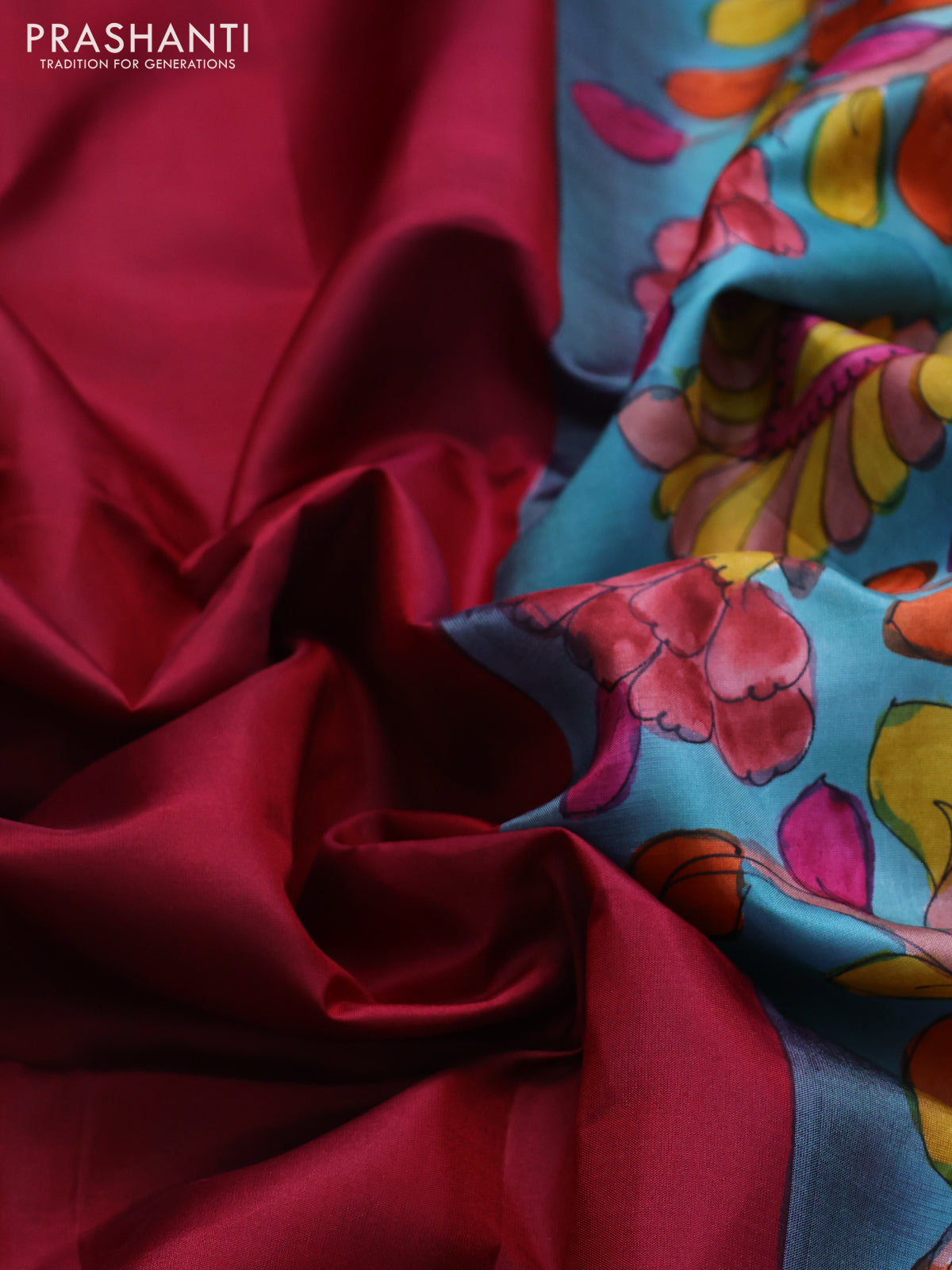 Pure soft silk saree maroon and teal blue with plain body and hand painted kalamkari printed pallu