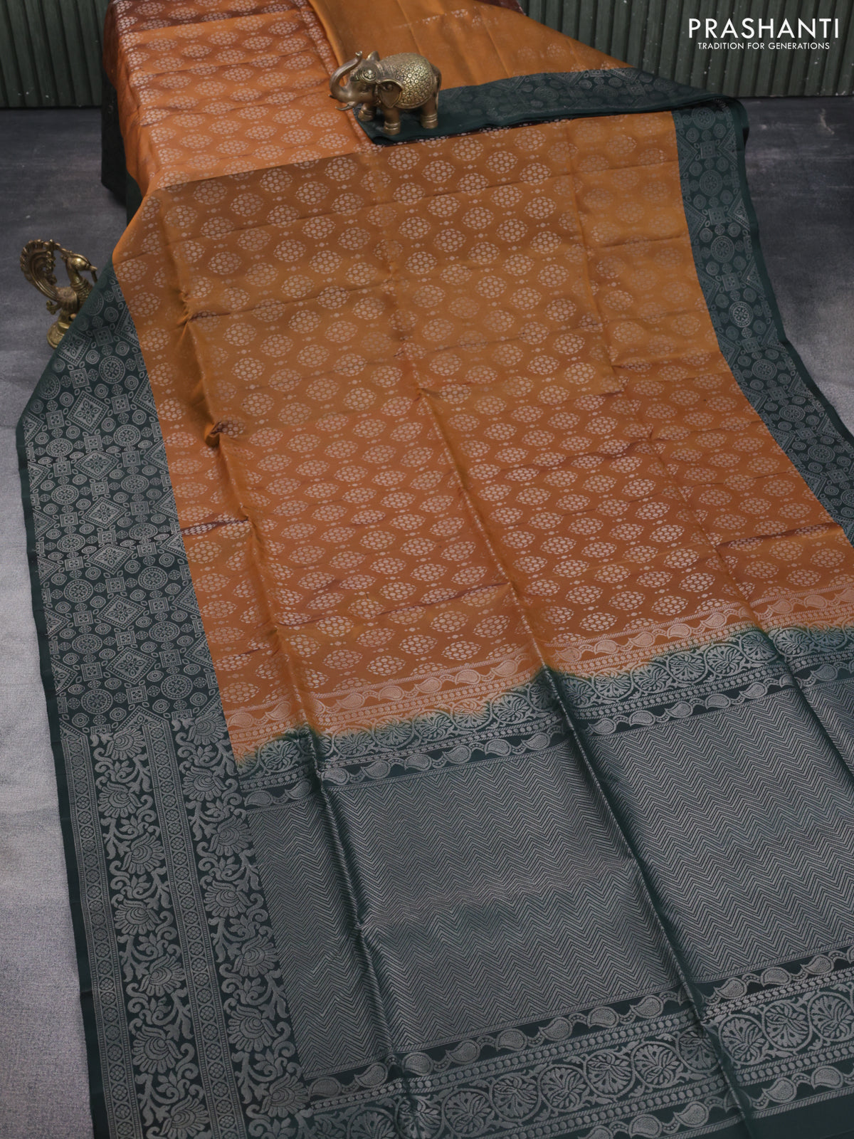 Pure soft silk saree mustard yellow and bottle green with allover silver zari woven brocade weaves and silver zari woven border