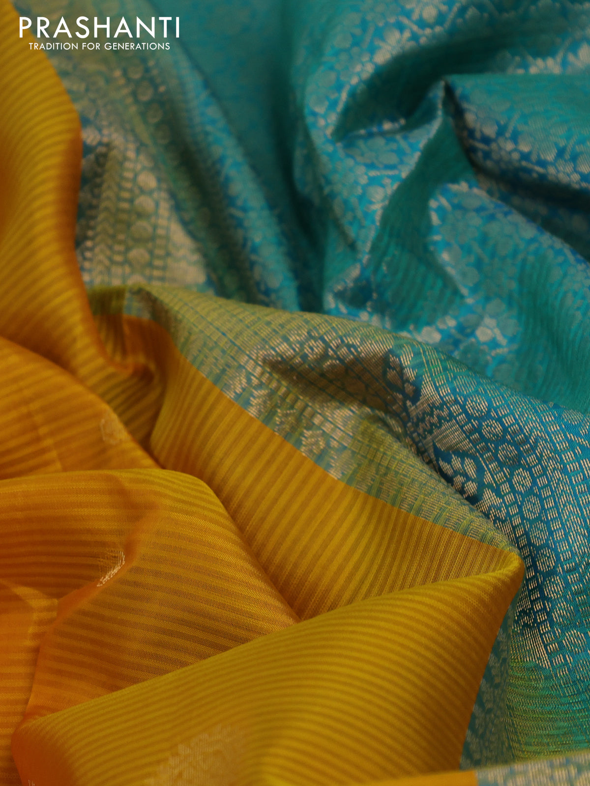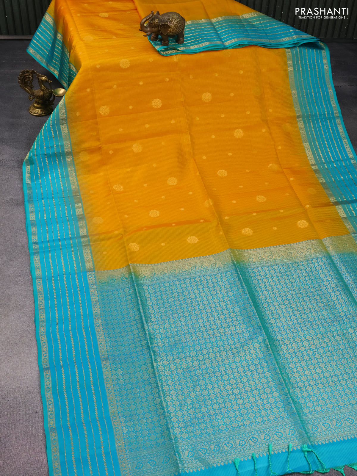 Pure soft silk saree mustard yellow and teal blue with zari wovenn buttas and zari woven border