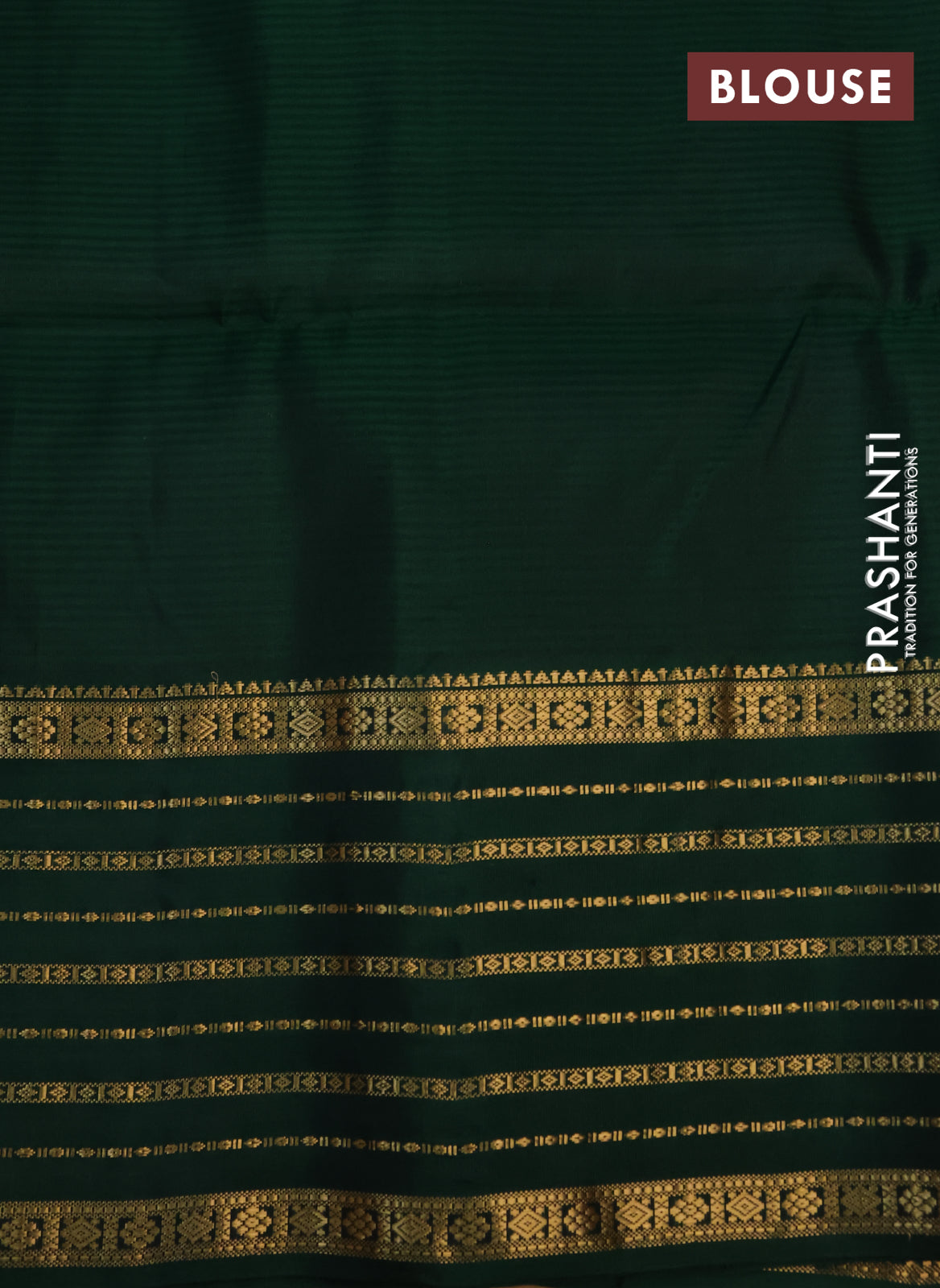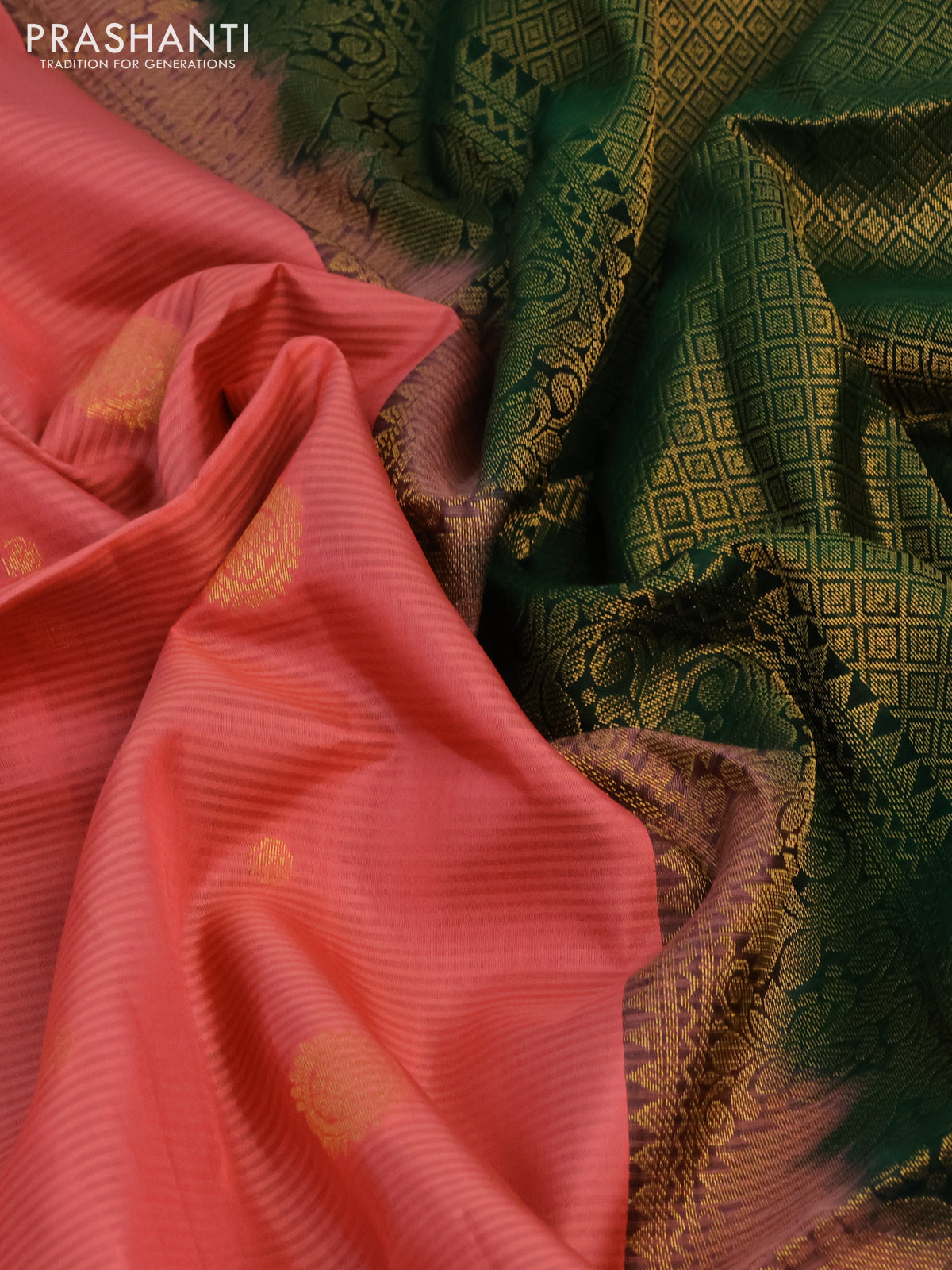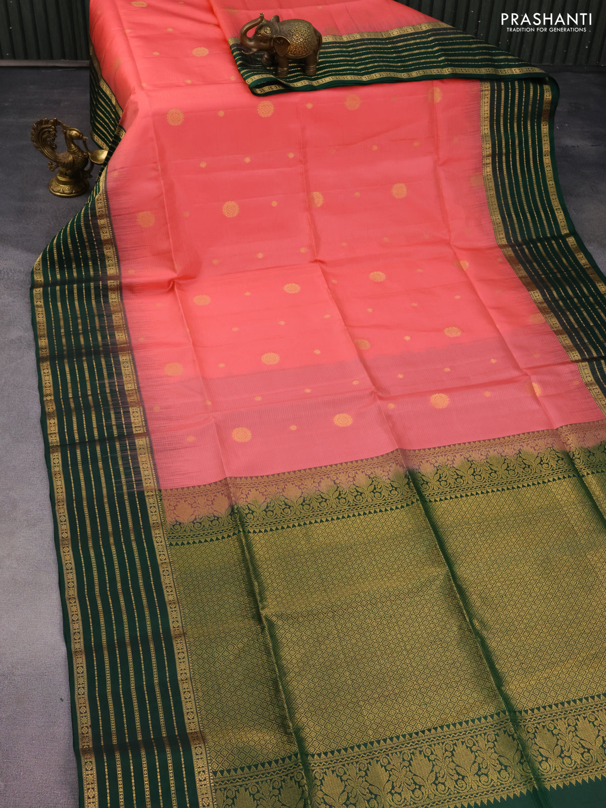 Pure soft silk saree peach pink and dark green with allover zari woven buttas and zari woven border