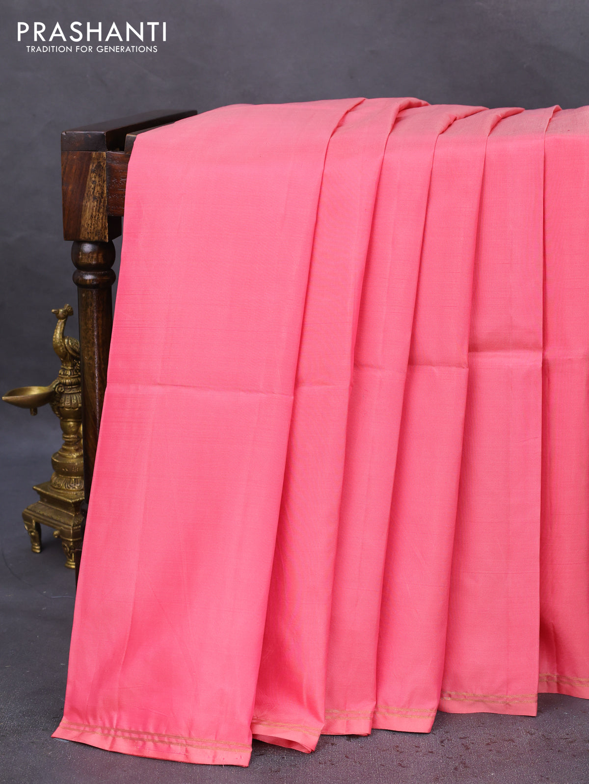 Pure soft silk saree peach pink and green with plain body and hand painted kalamkari pallu