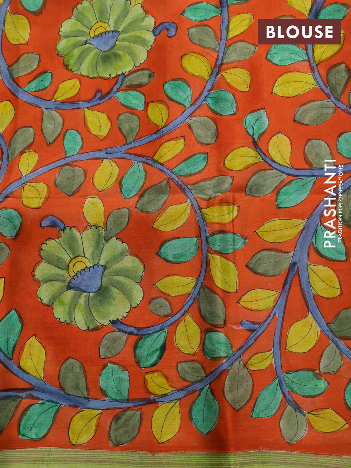 Pure soft silk saree pista green and orange with allover stripes pattern and hand painted kalamkari printed pallu