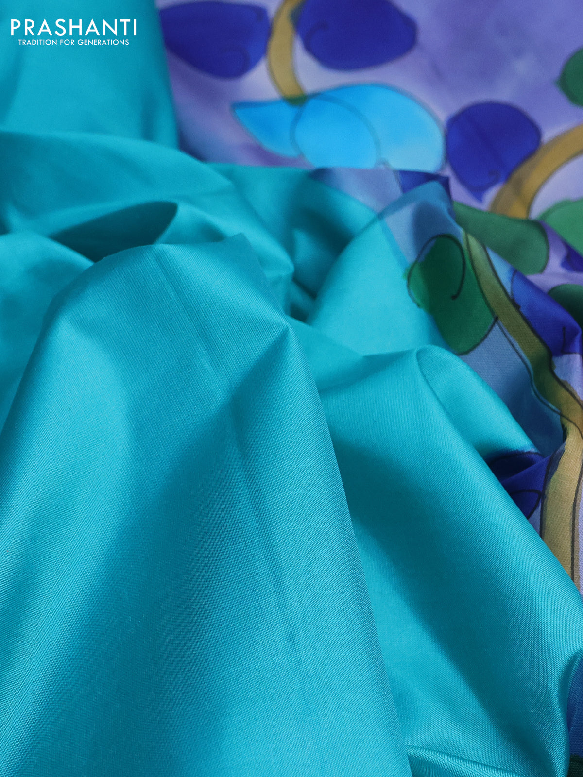 Pure soft silk saree teal blue and pastel blue with plain body and hand painted pallu & blouse