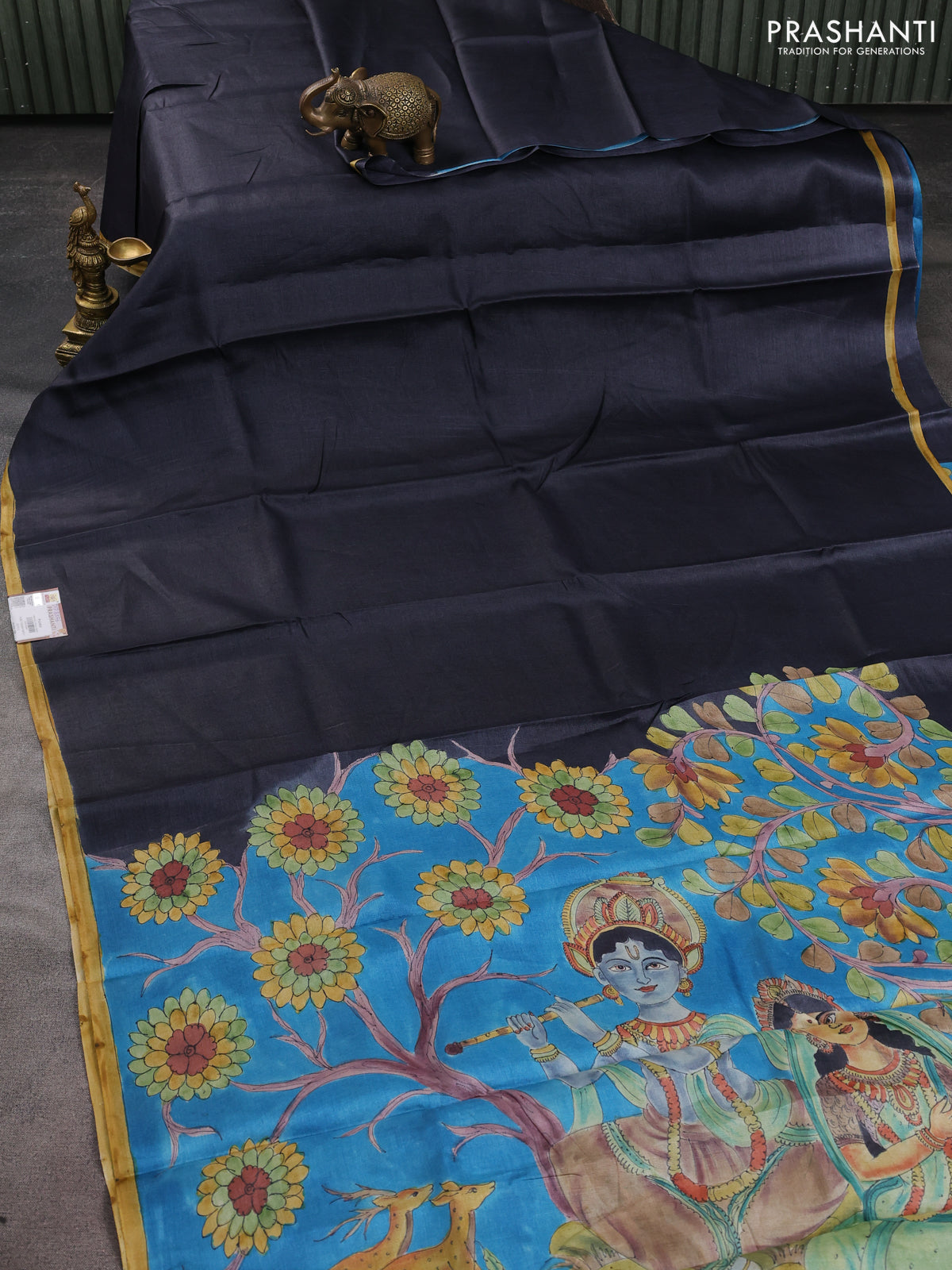 Pure tussar partly silk saree black and cs blue with plain body and kalamkari hand painted prints