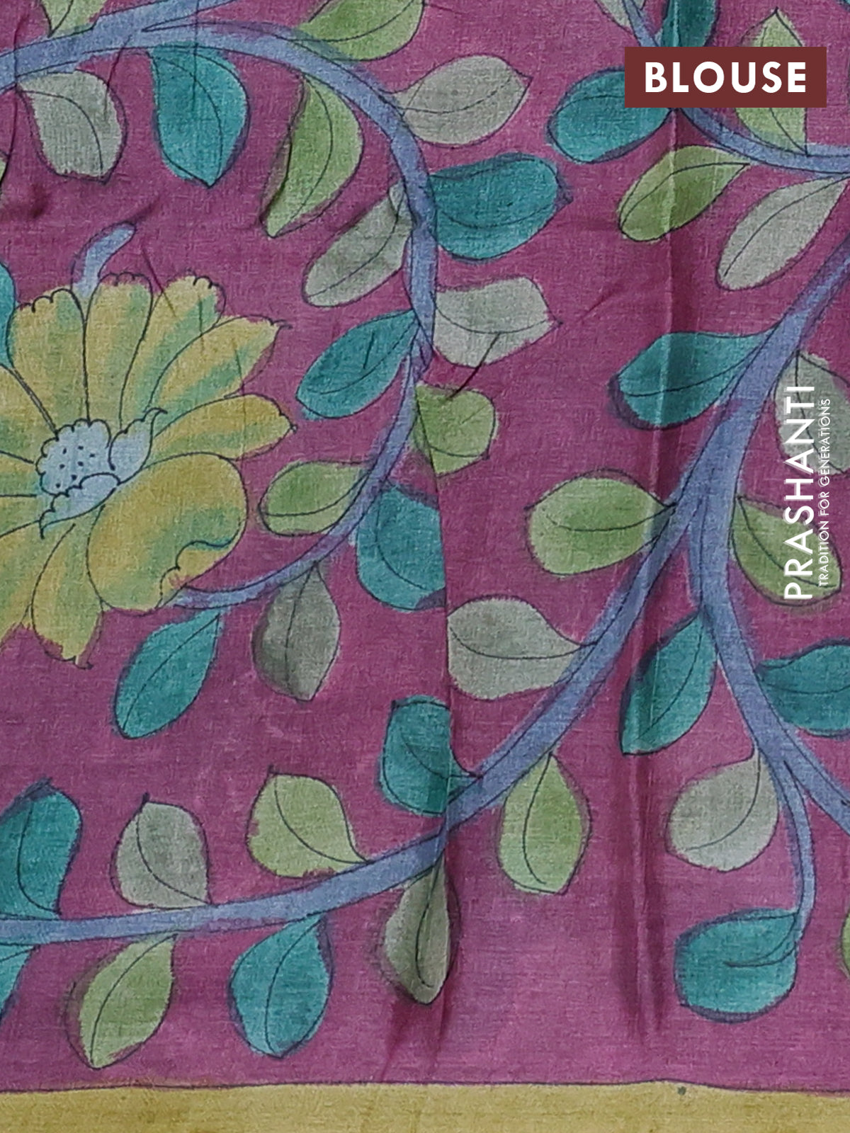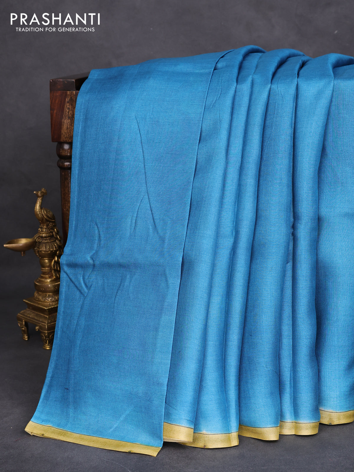 Pure tussar partly silk saree cs blue and purple shade with plain body and kalamkari hand painted prints