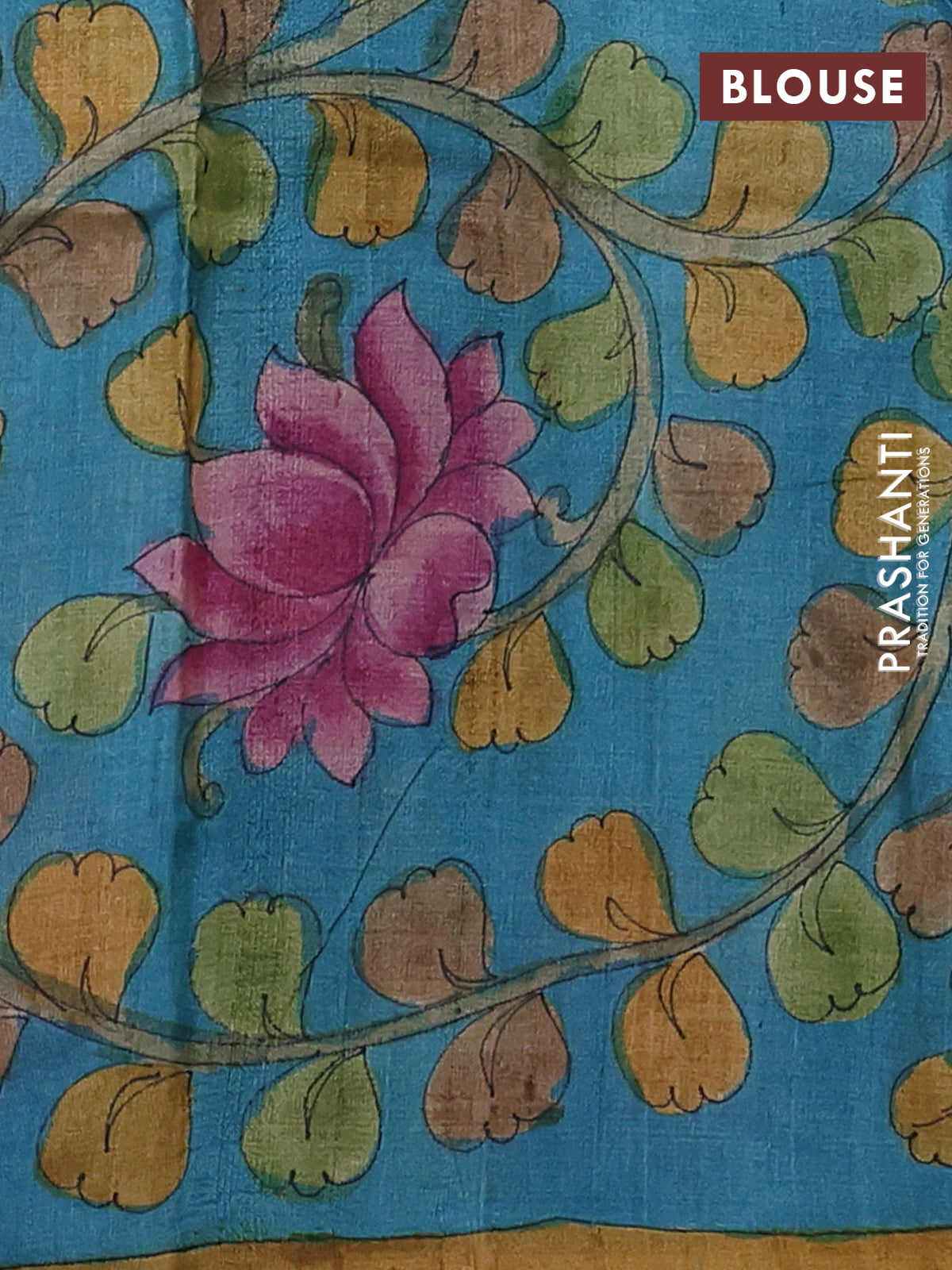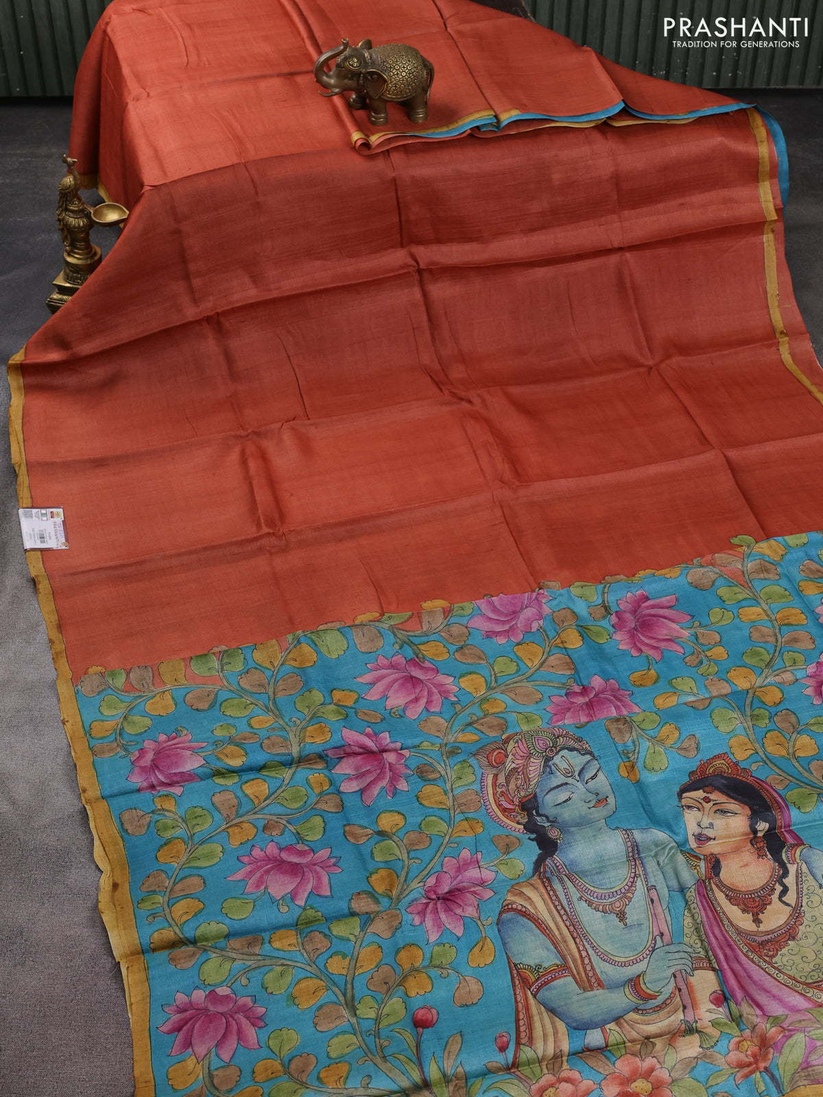 Pure tussar partly silk saree rustic orange and cs blue with plain body and kalamkari hand painted prints