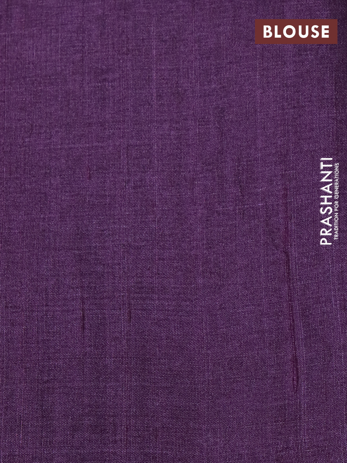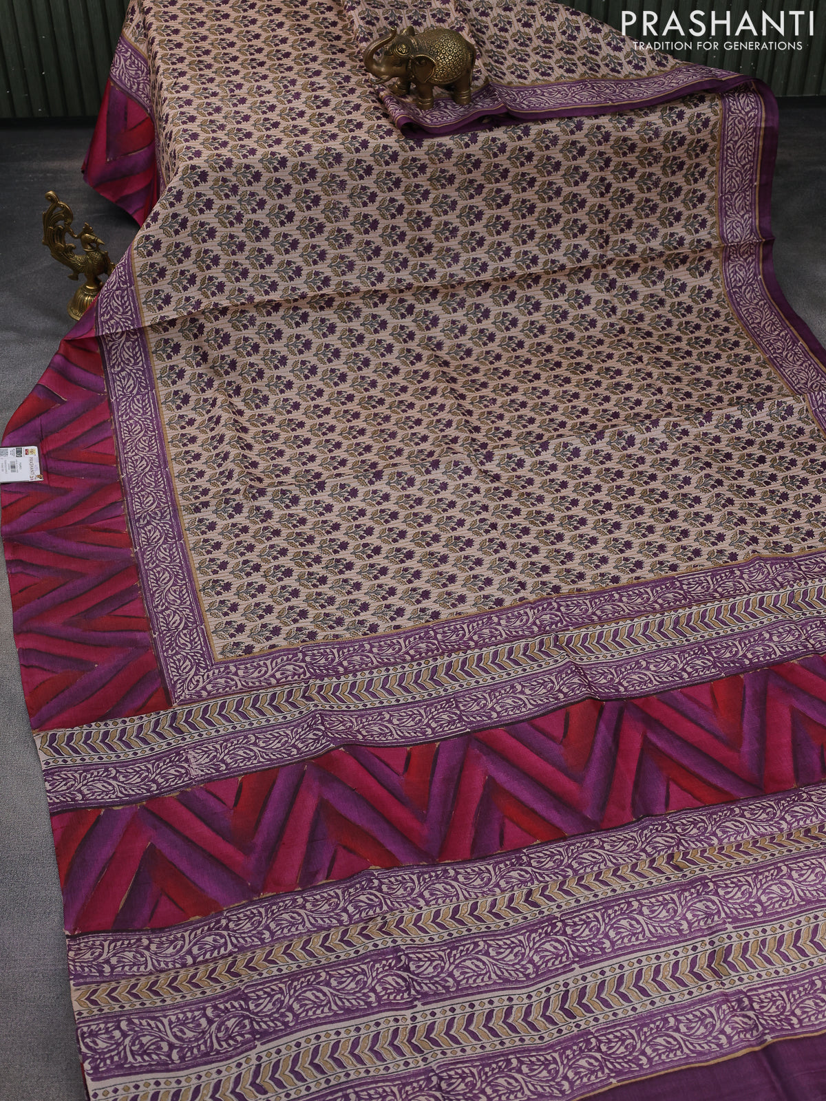 Pure tussar silk saree beige and purple with allover floral digital prints and long printed border
