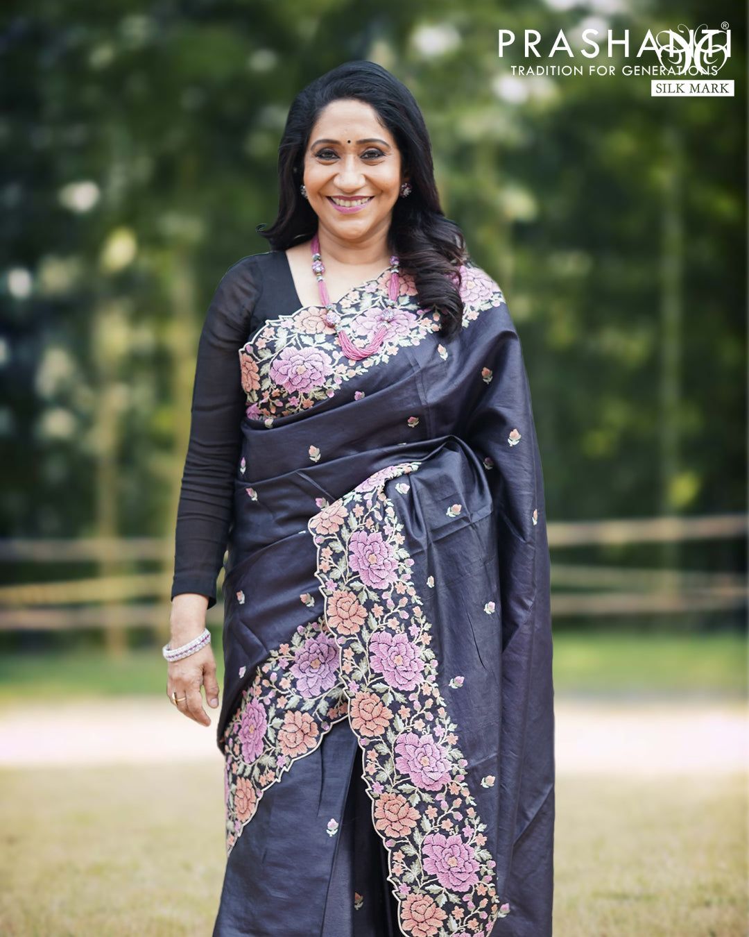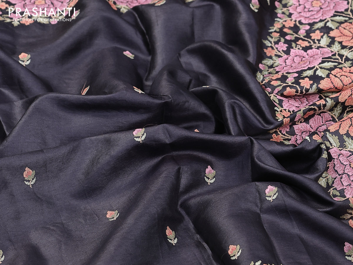 Pure tussar silk saree black with allover embroidery work buttas and floral design embroidery work border