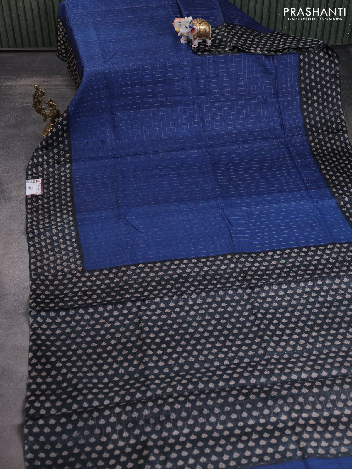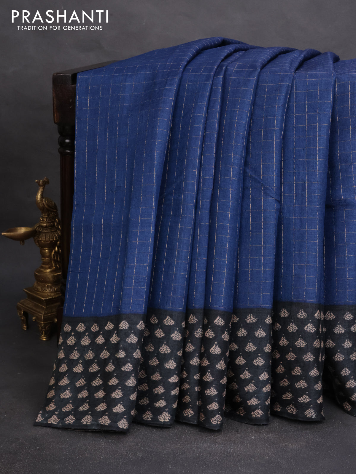 Pure tussar silk saree blue and black with allover zari checked pattern and printed border