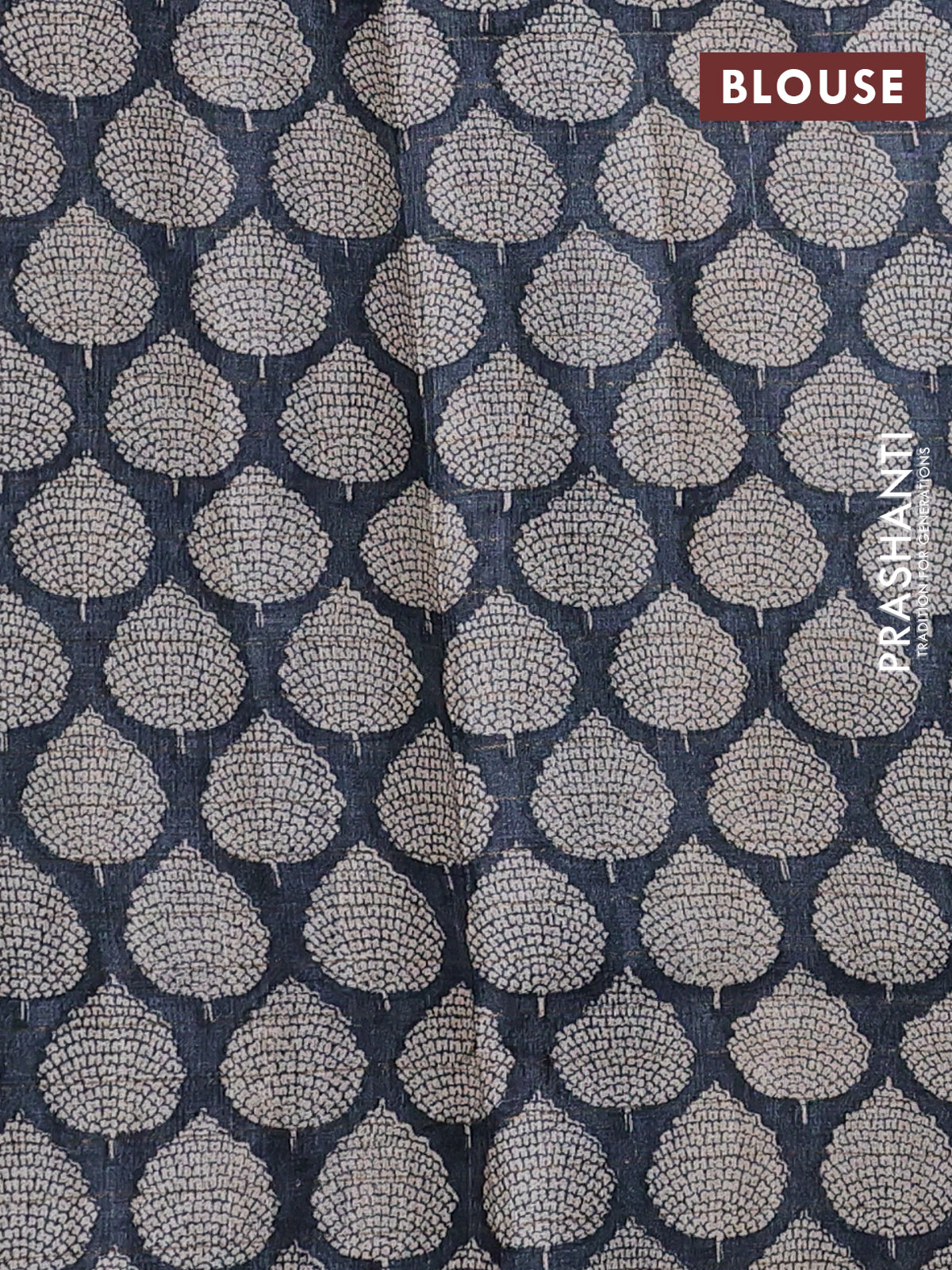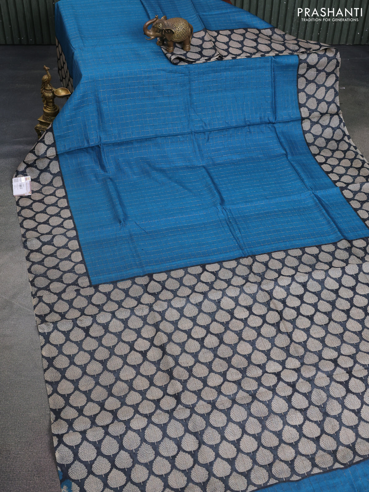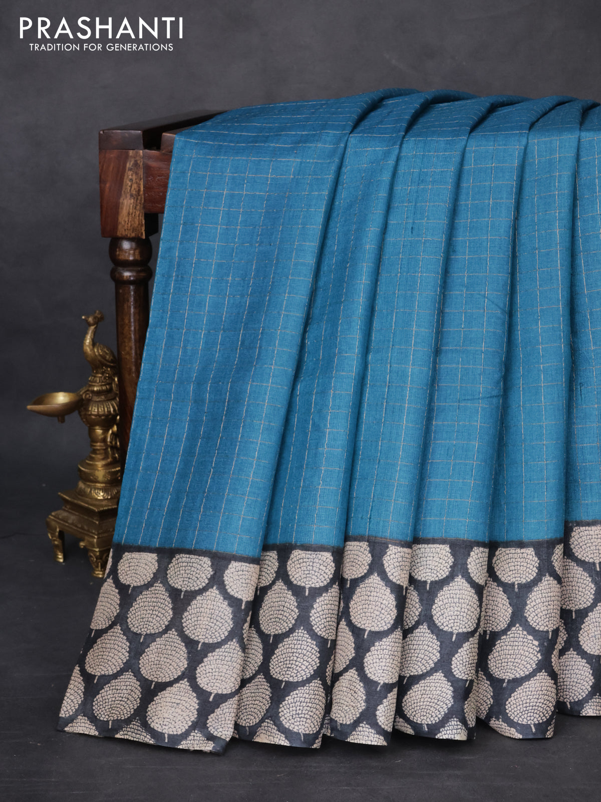 Pure tussar silk saree blue and black with allover zari checked pattern and printed butta border