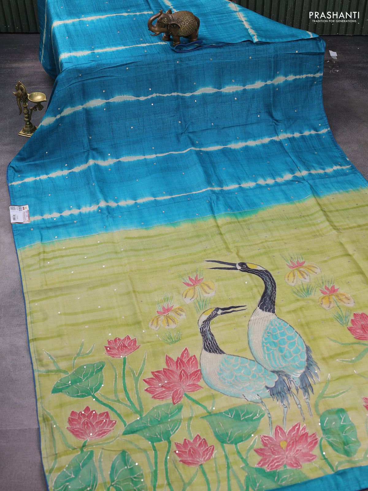 Pure tussar silk saree blue and pista green with tie & dye prints and pita work pallu