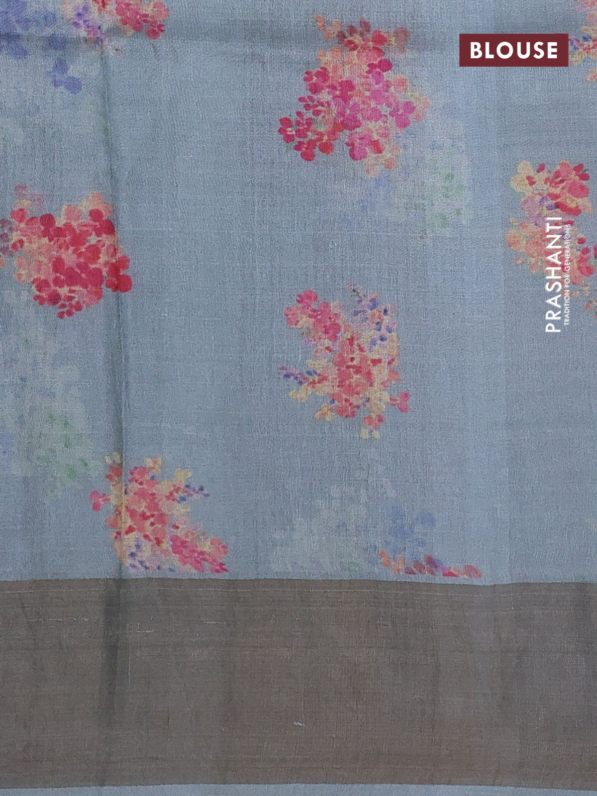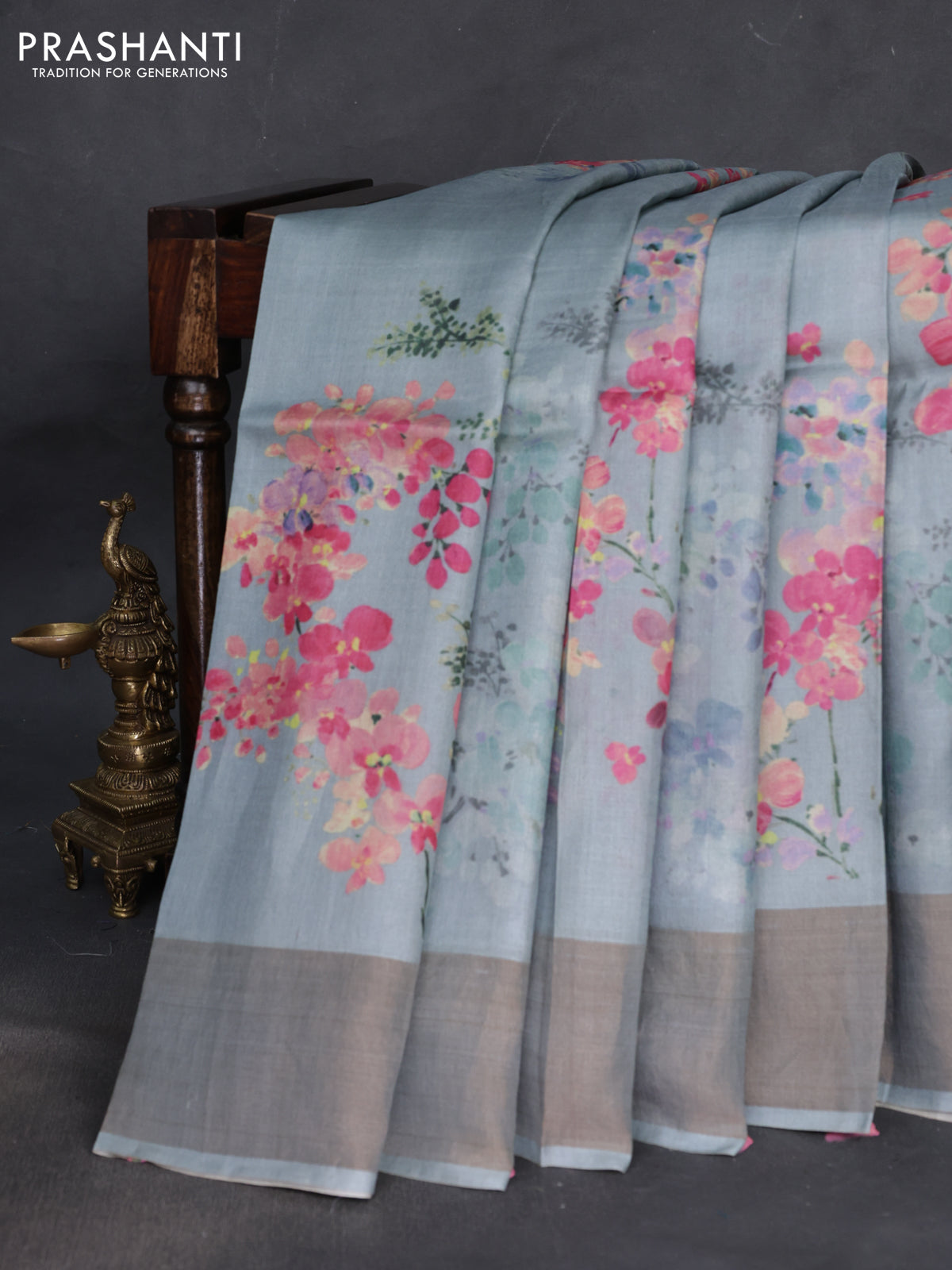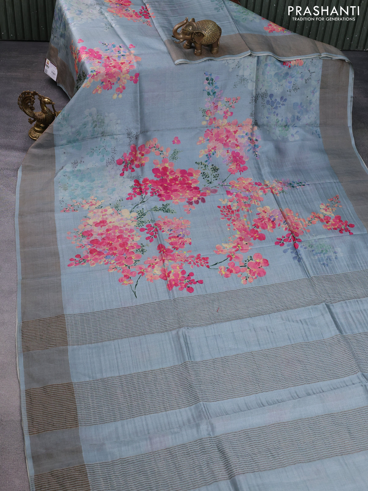 Pure tussar silk saree bluish grey with floral digital prints and zari woven border