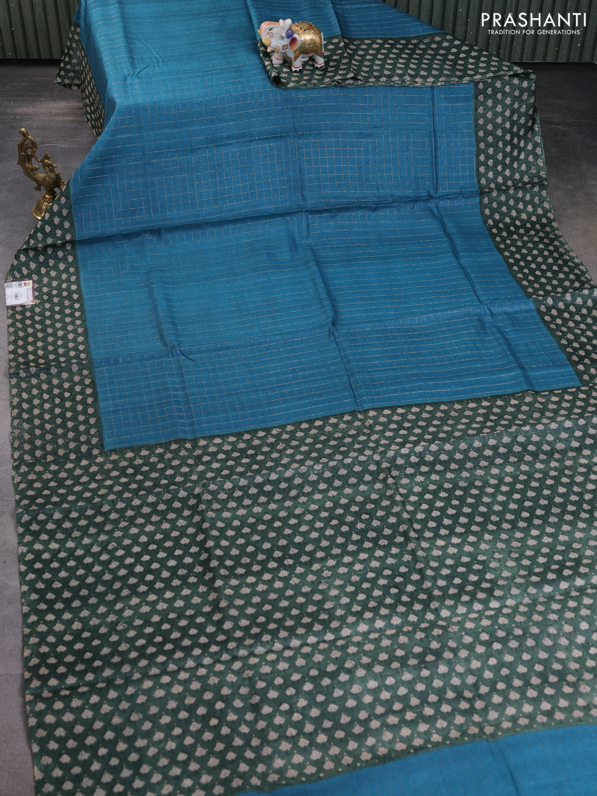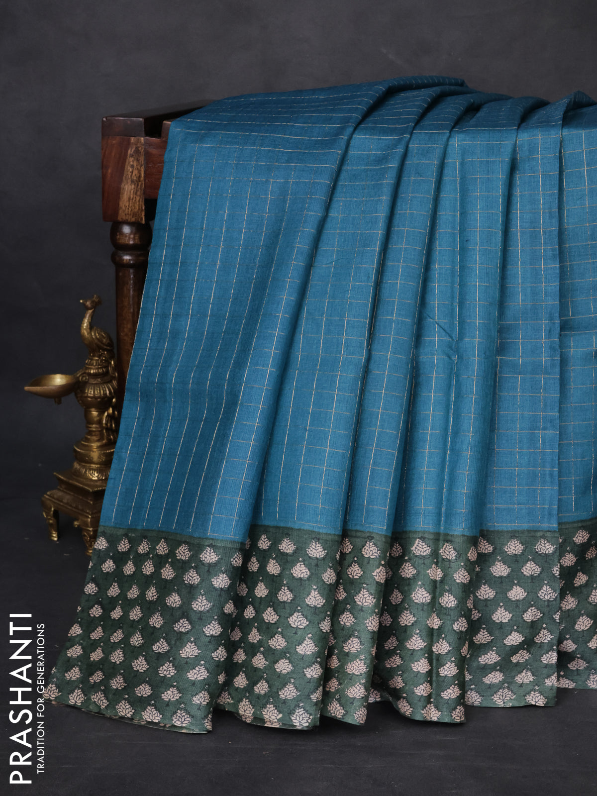 Pure tussar silk saree cs blue and dark green with allover zari checked pattern and printed border