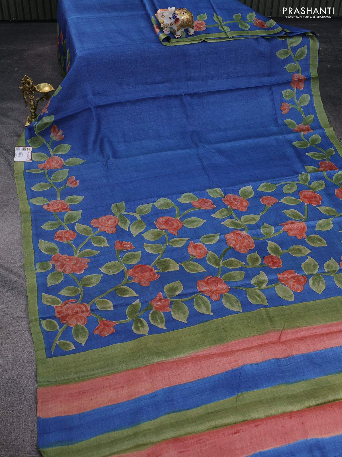 Pure tussar silk saree cs blue and pastel green with hand painted prints and simple border