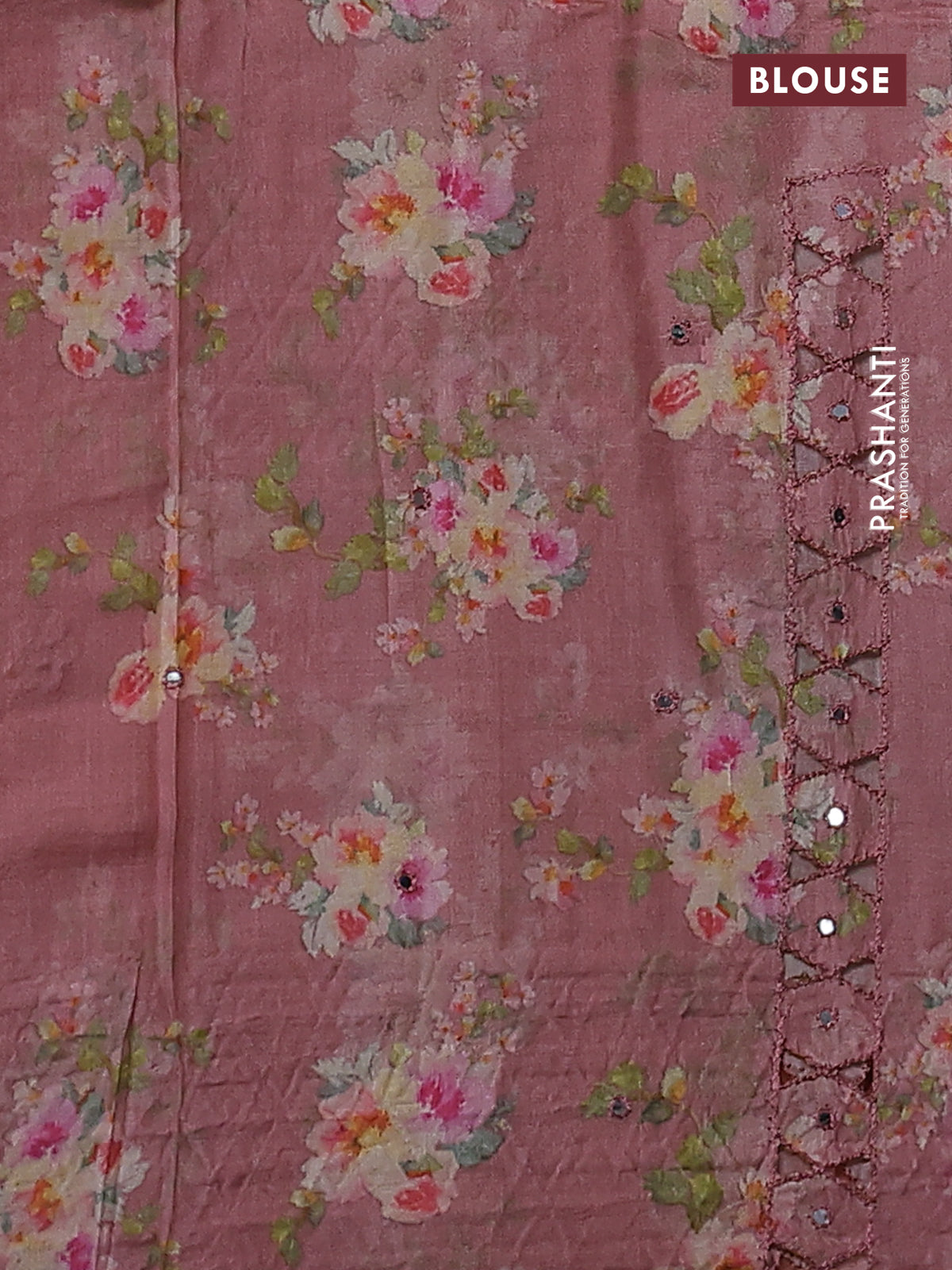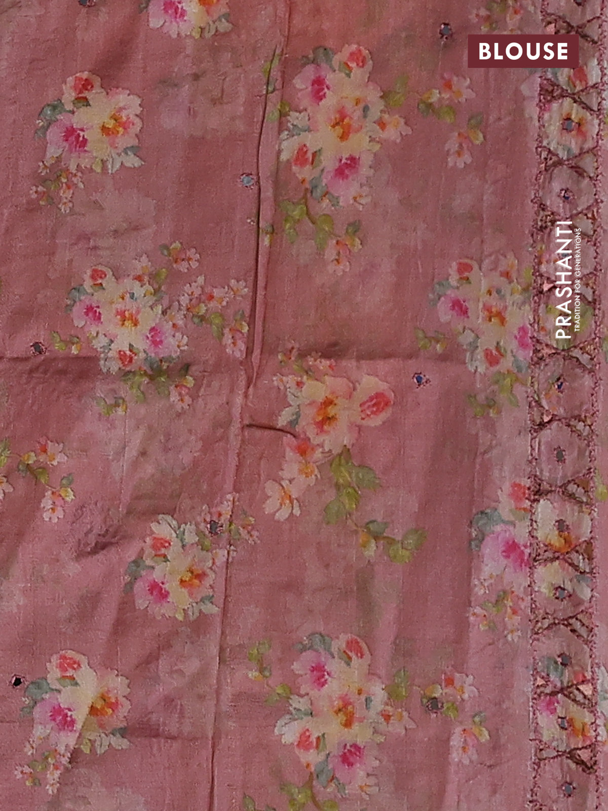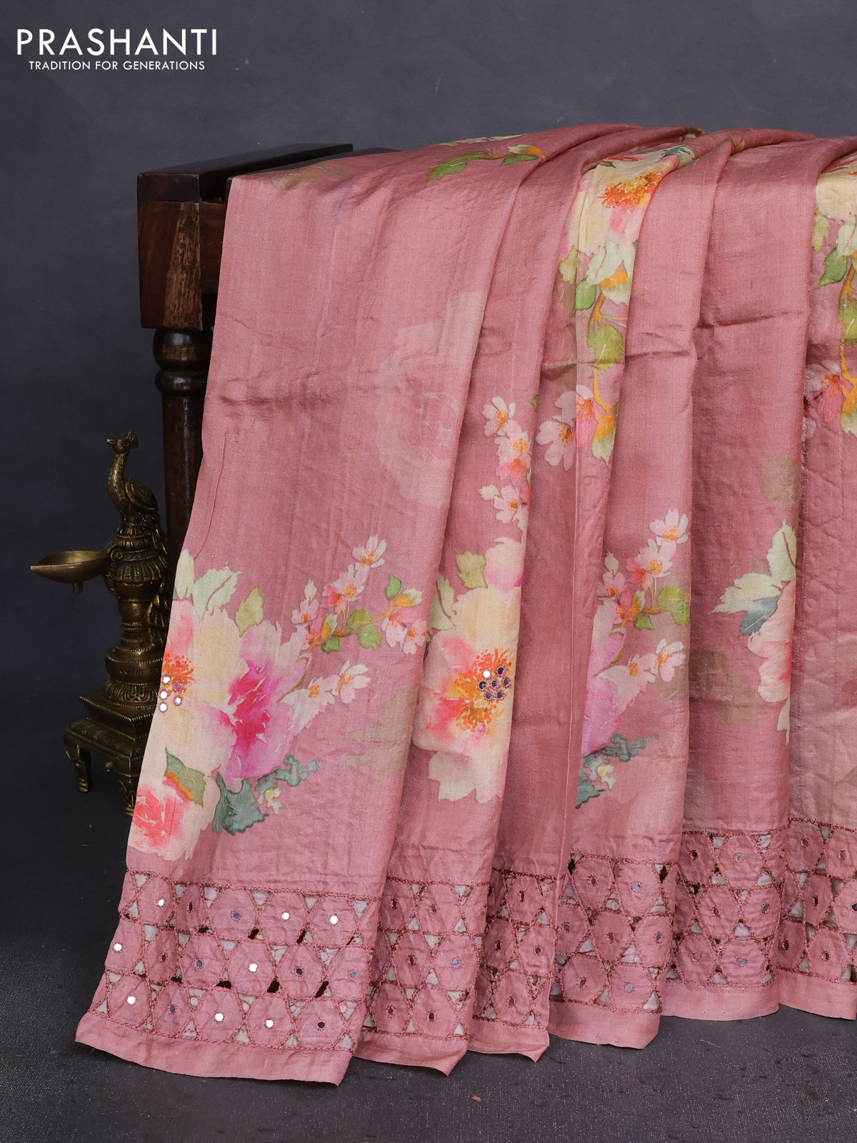 Pure tussar silk saree dark peach with floral digital prints & mirror work and cut work border