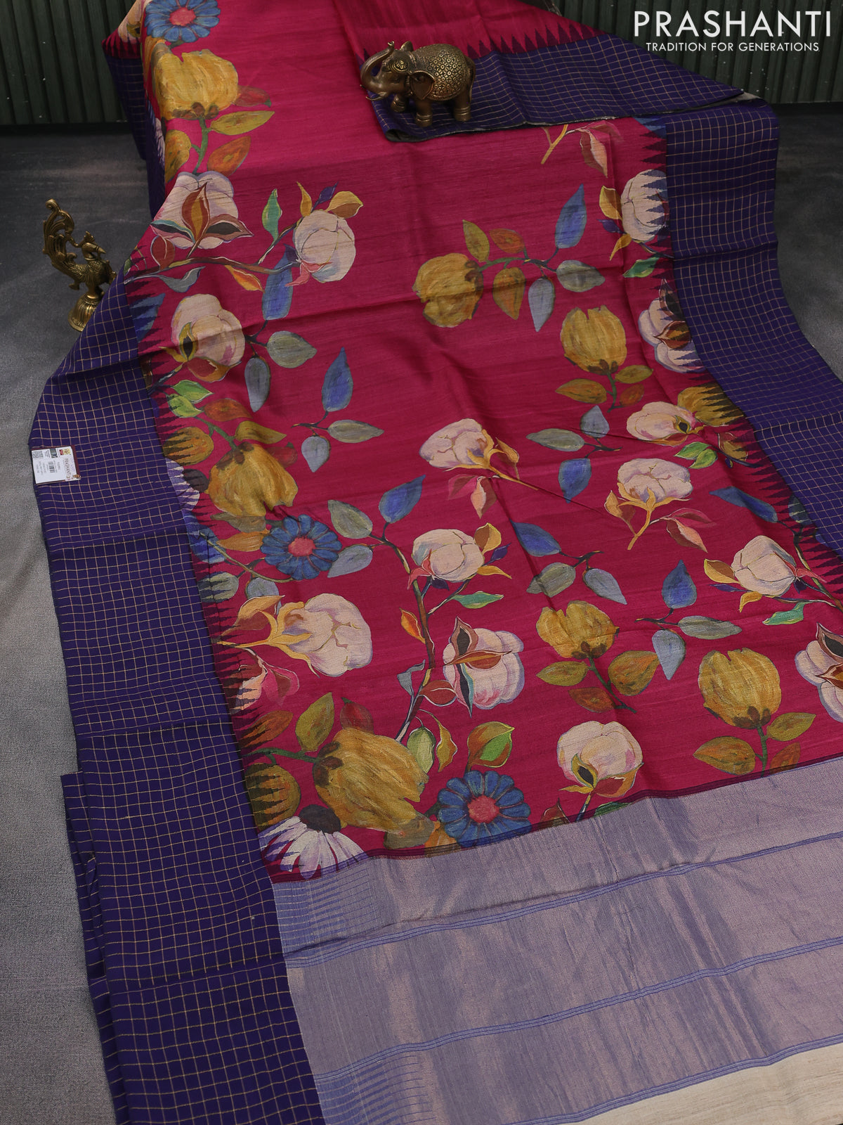 Pure tussar silk saree dark pink and navy blue with allover floral digital prints and temple design zari checks border