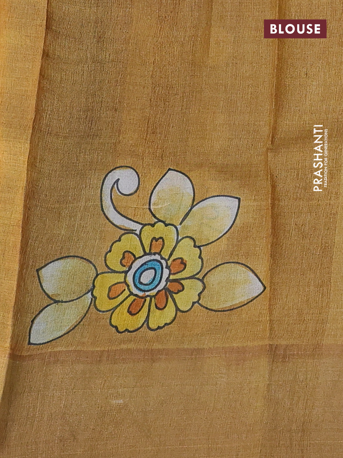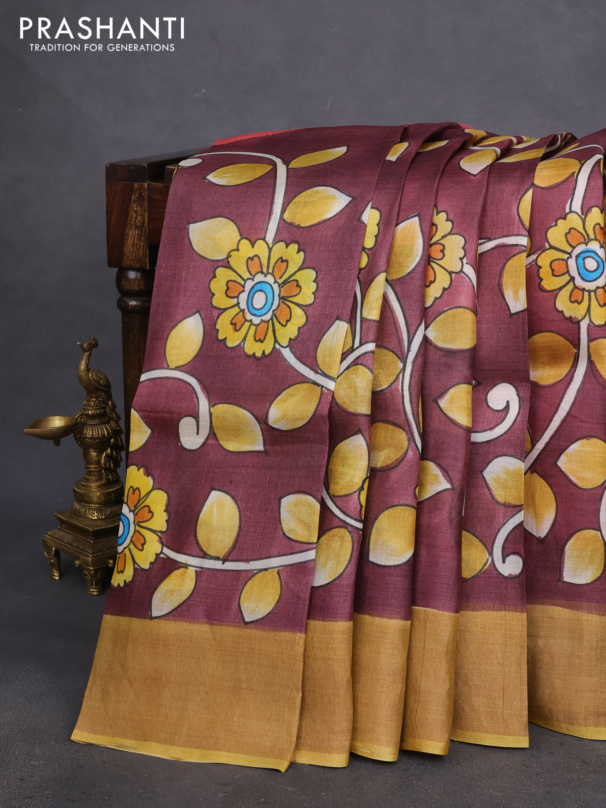 Pure tussar silk saree deep maroon and peach pink mustard shade with allover kalamkari hand painted prints and zari woven border