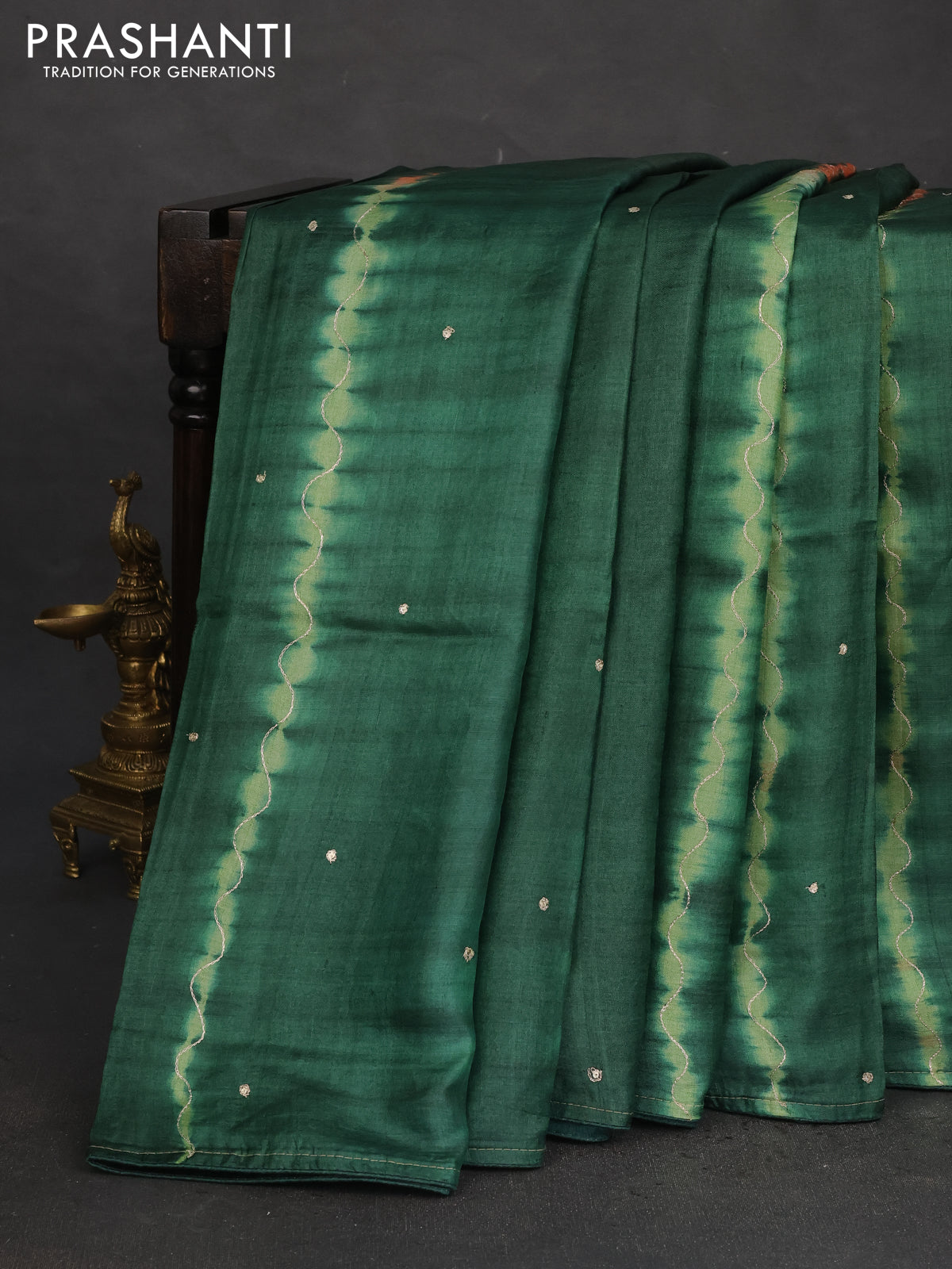 Pure tussar silk saree green and sandal with tie & dye prints & pita work and embroidery pallu
