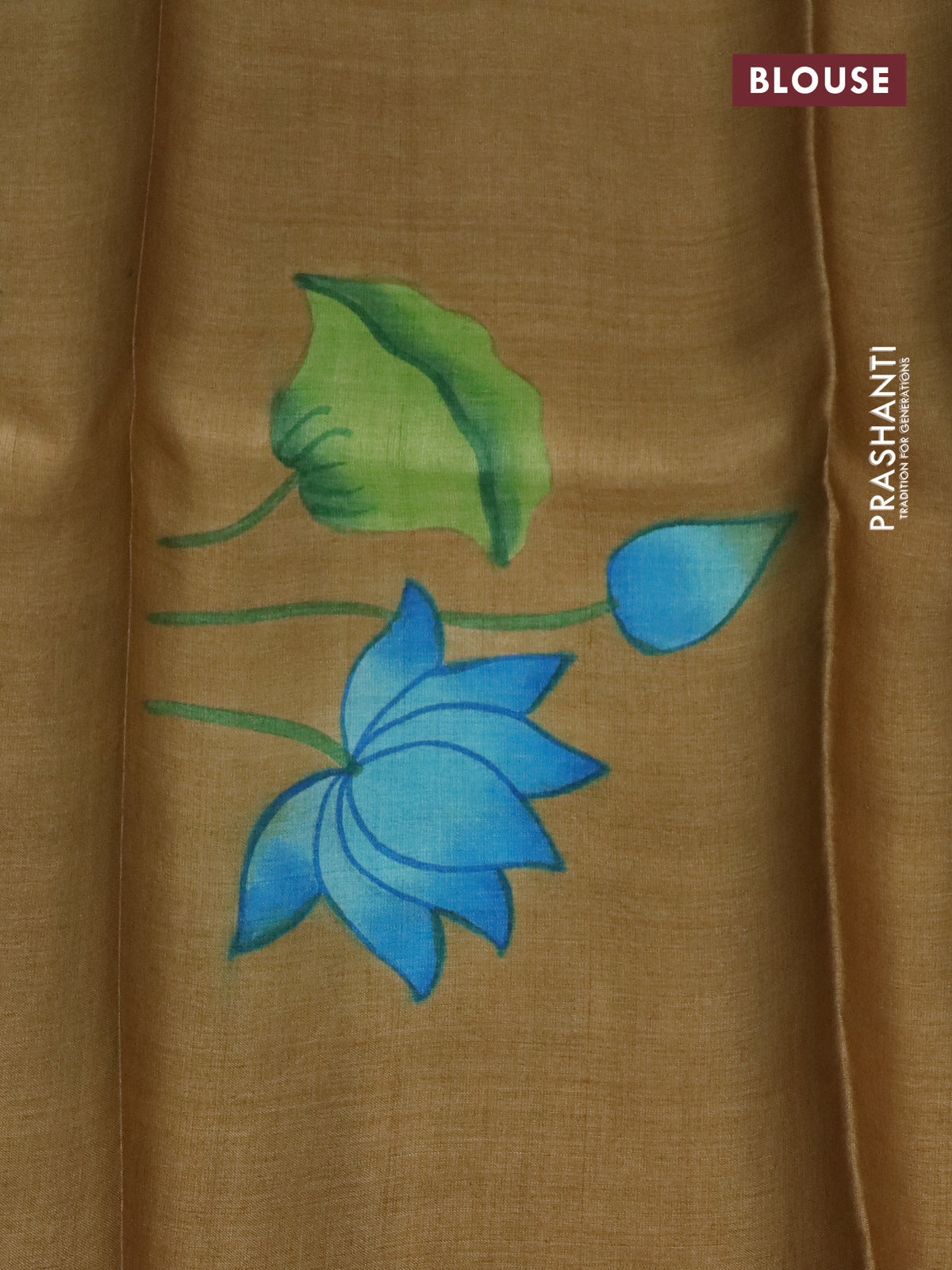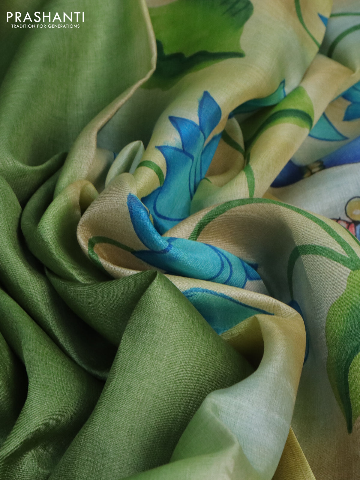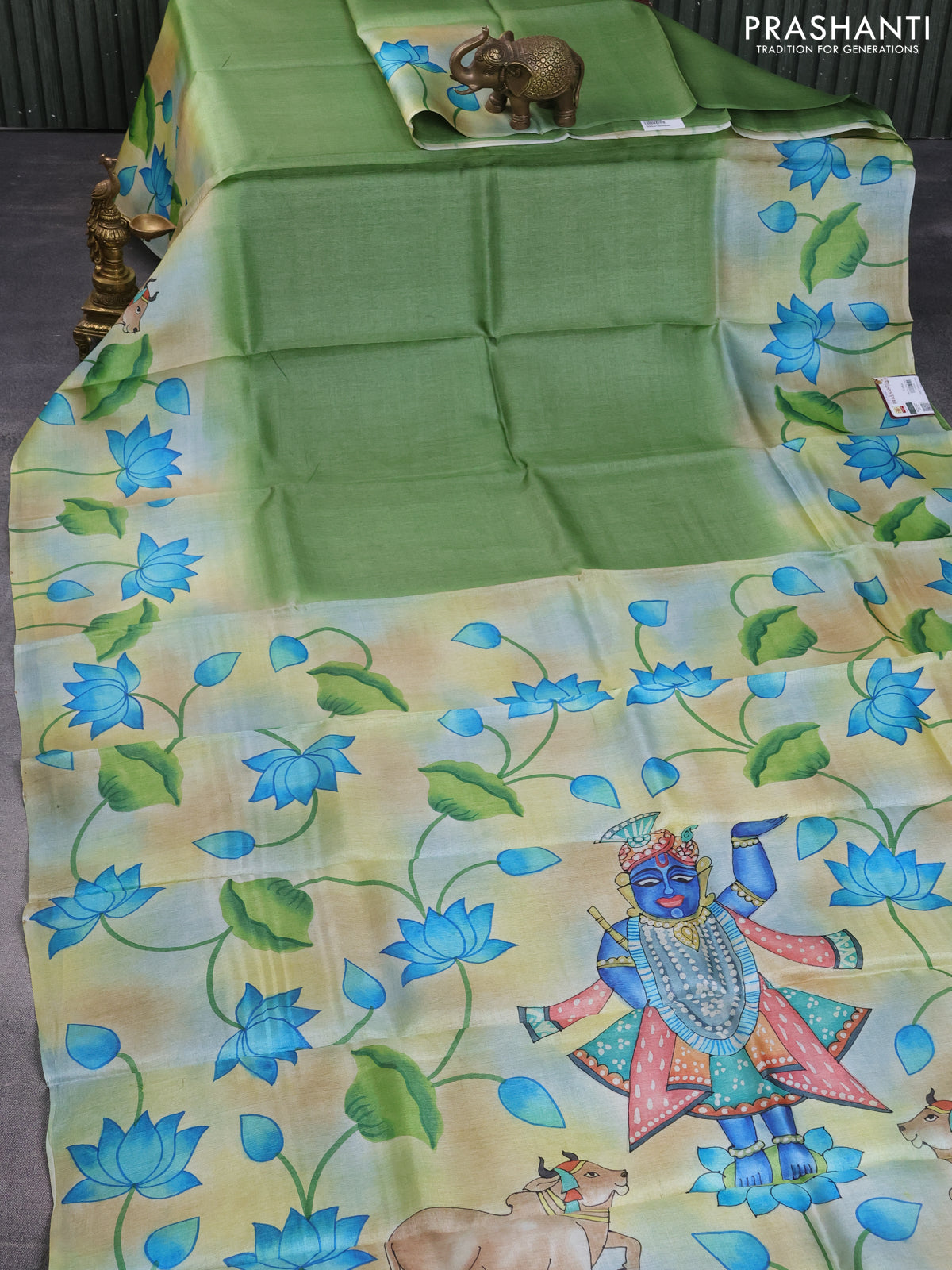 Pure tussar silk saree green shade and sandal with plain body and pichwai hand painted pallu & border