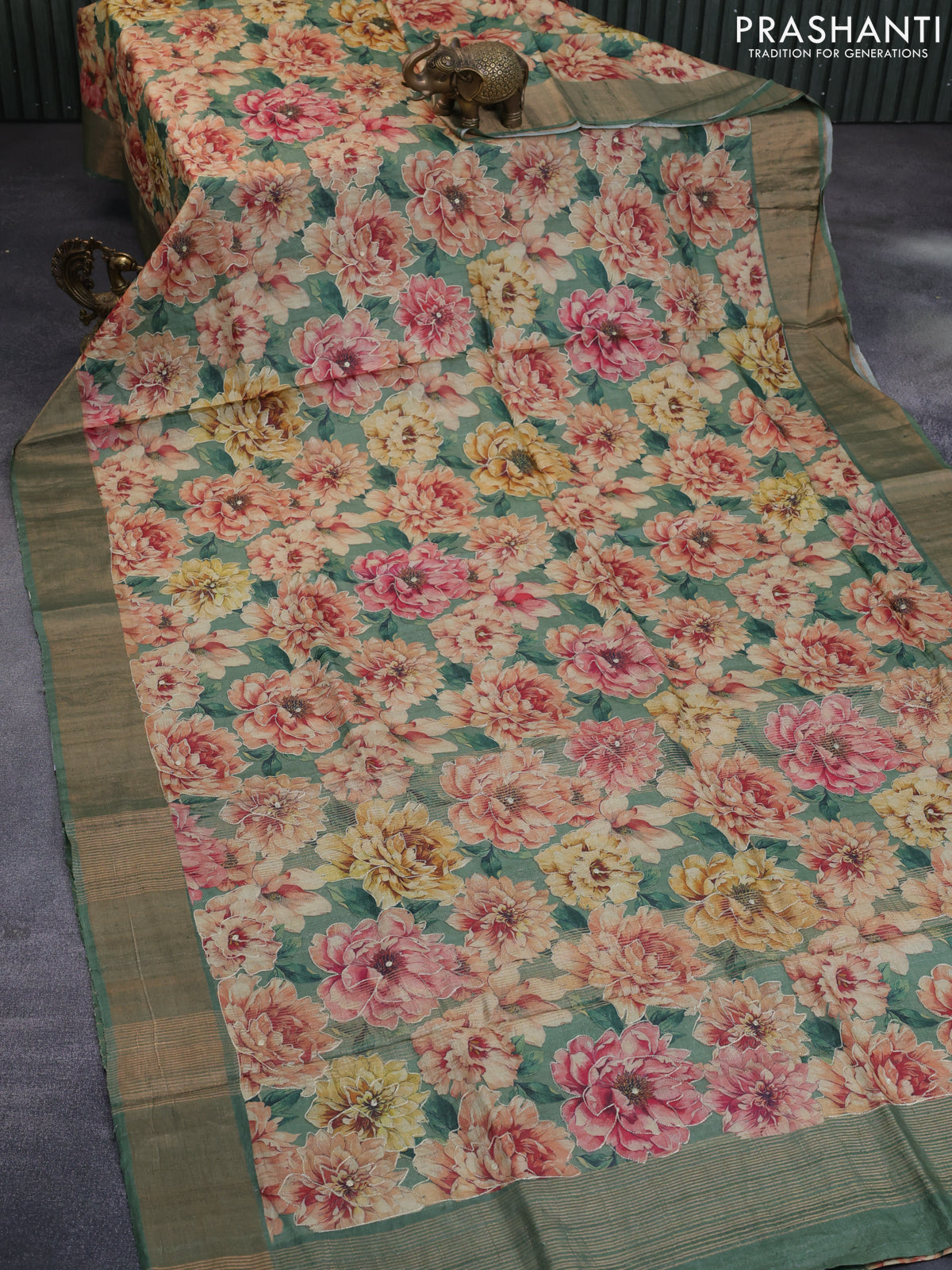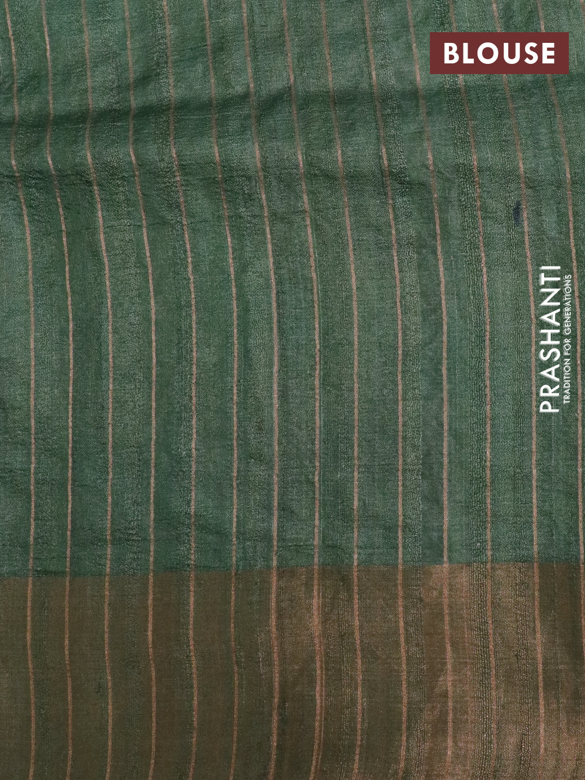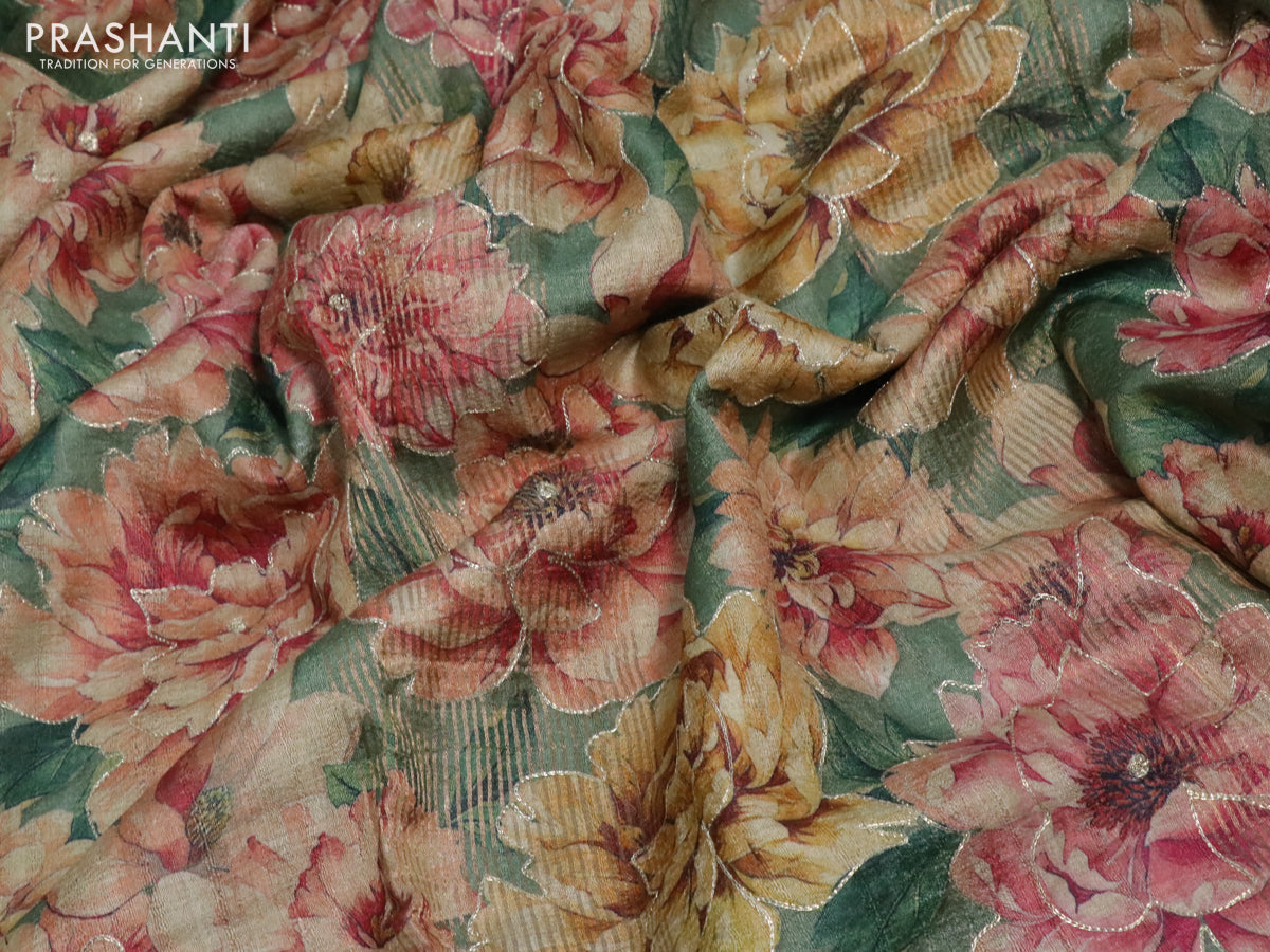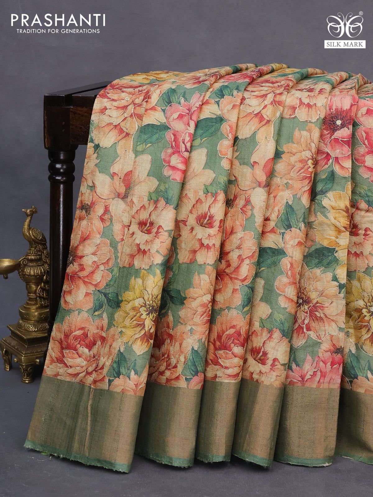Pure tussar silk saree green shade with allover floral design pita work and zari woven border
