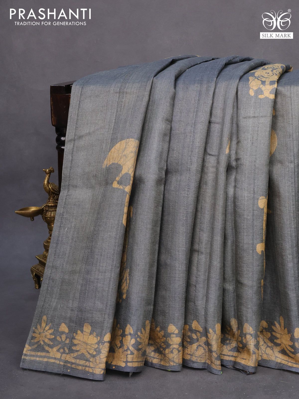Pure tussar silk saree grey and beige with batik butta prints and printed border