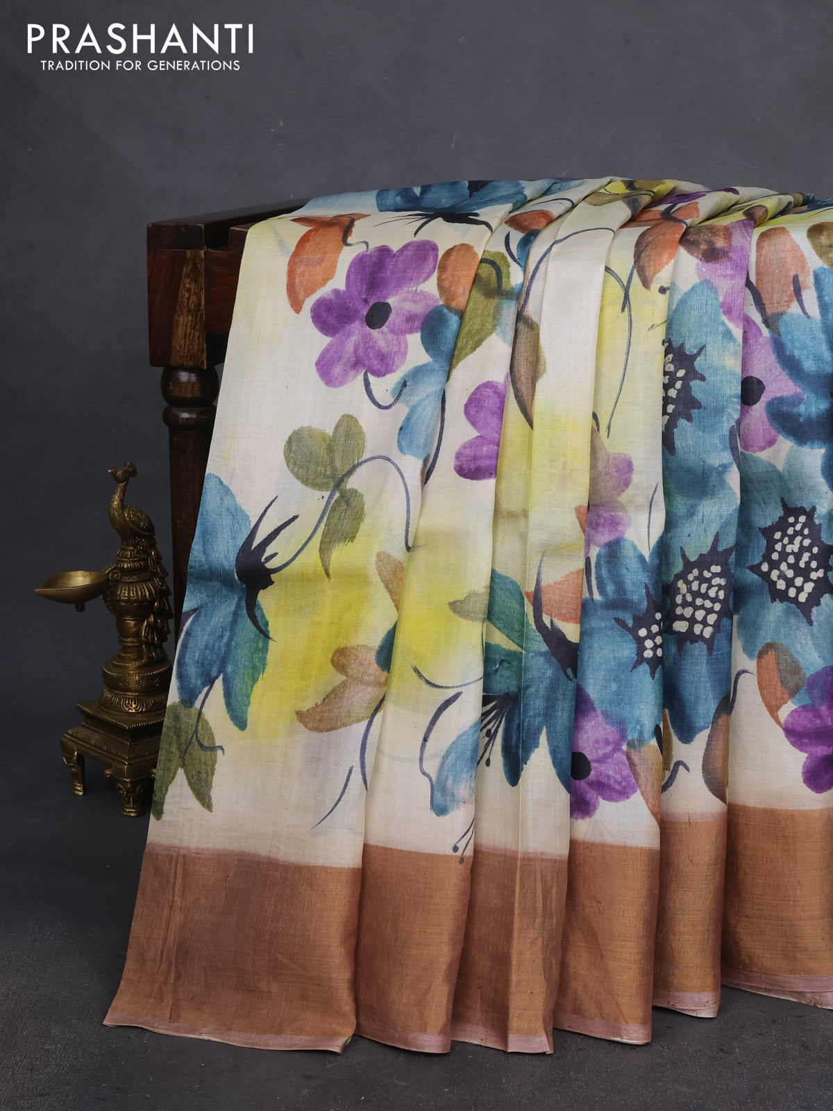 Pure tussar silk saree grey off white and pastel brown with allover hand painted prints and zari woven border