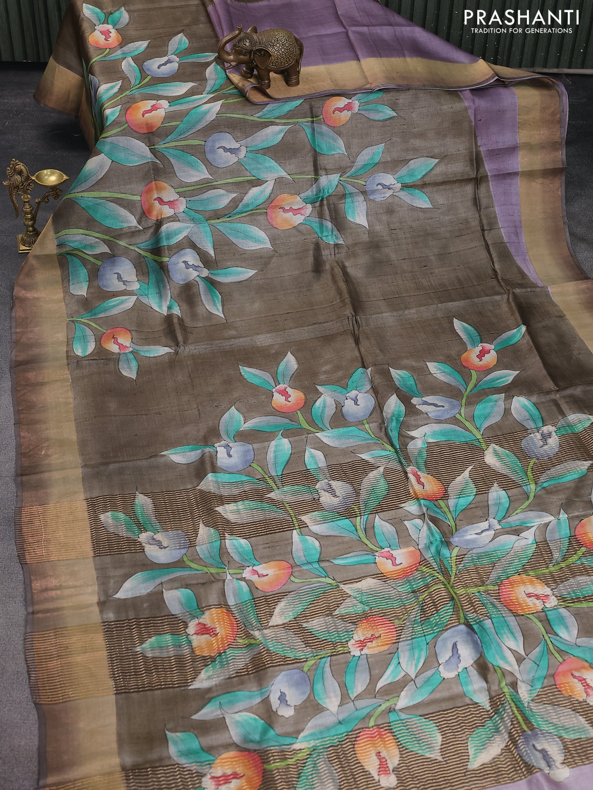 Pure tussar silk saree grey shade with allover floral hand painted prints and zari woven border