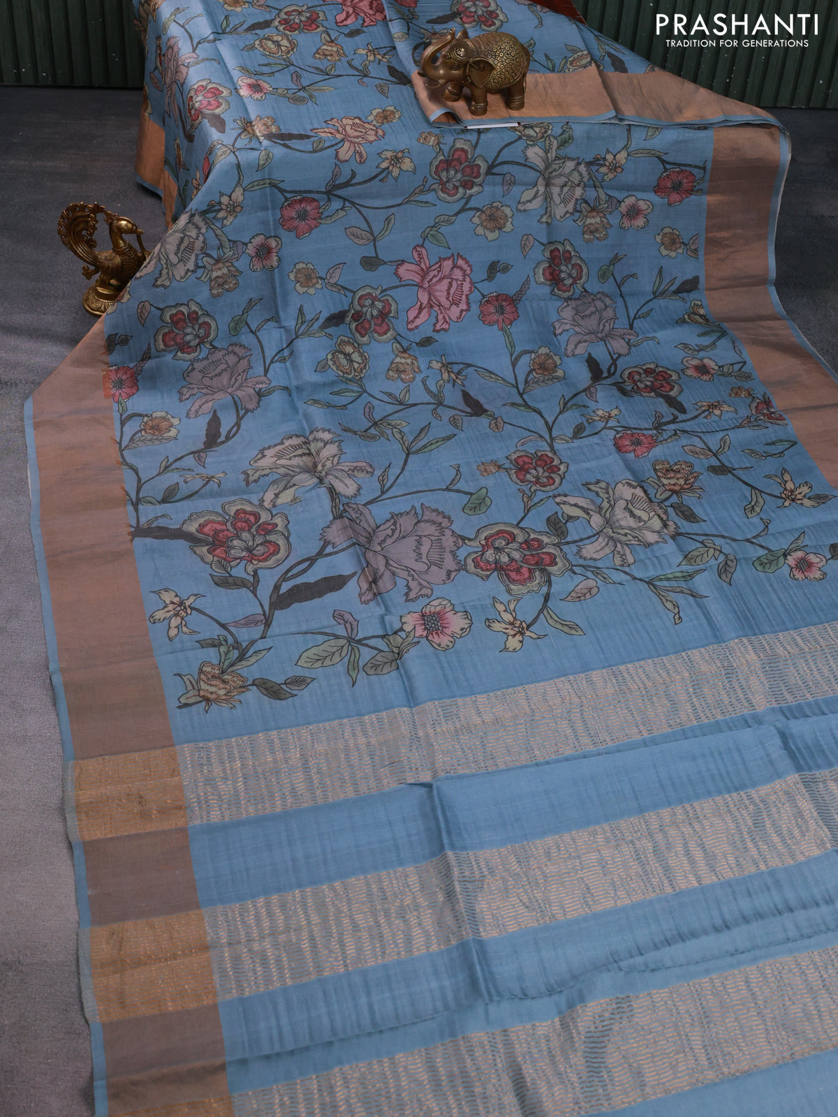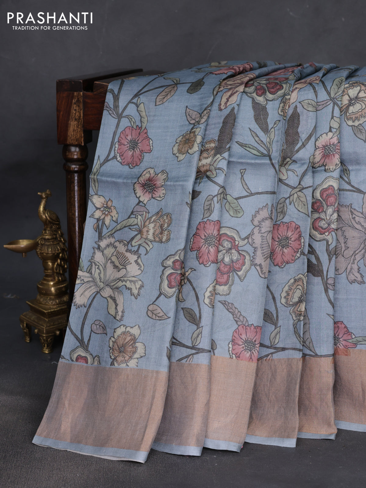 Pure tussar silk saree grey with allover floral digital prints and zari woven border