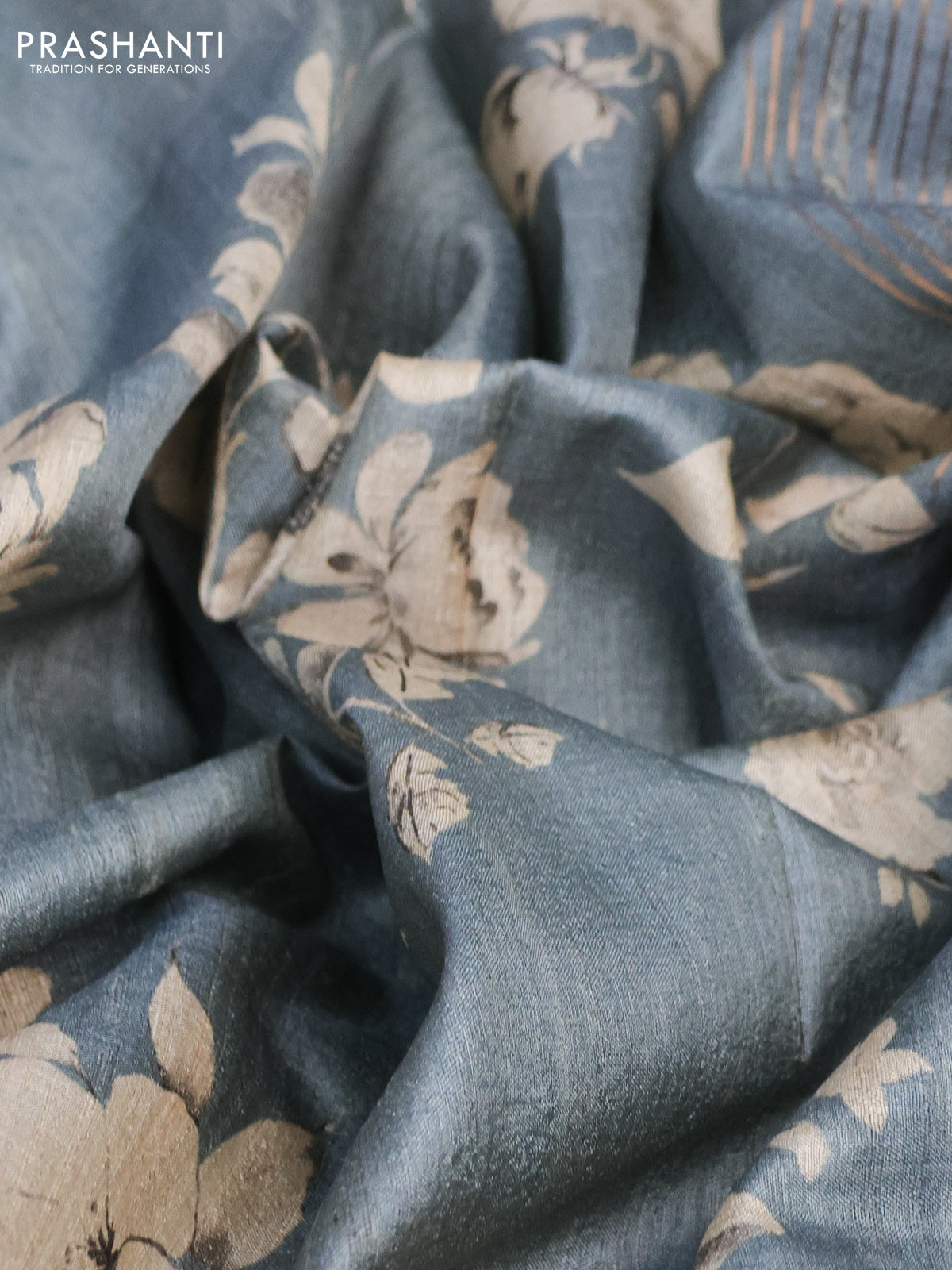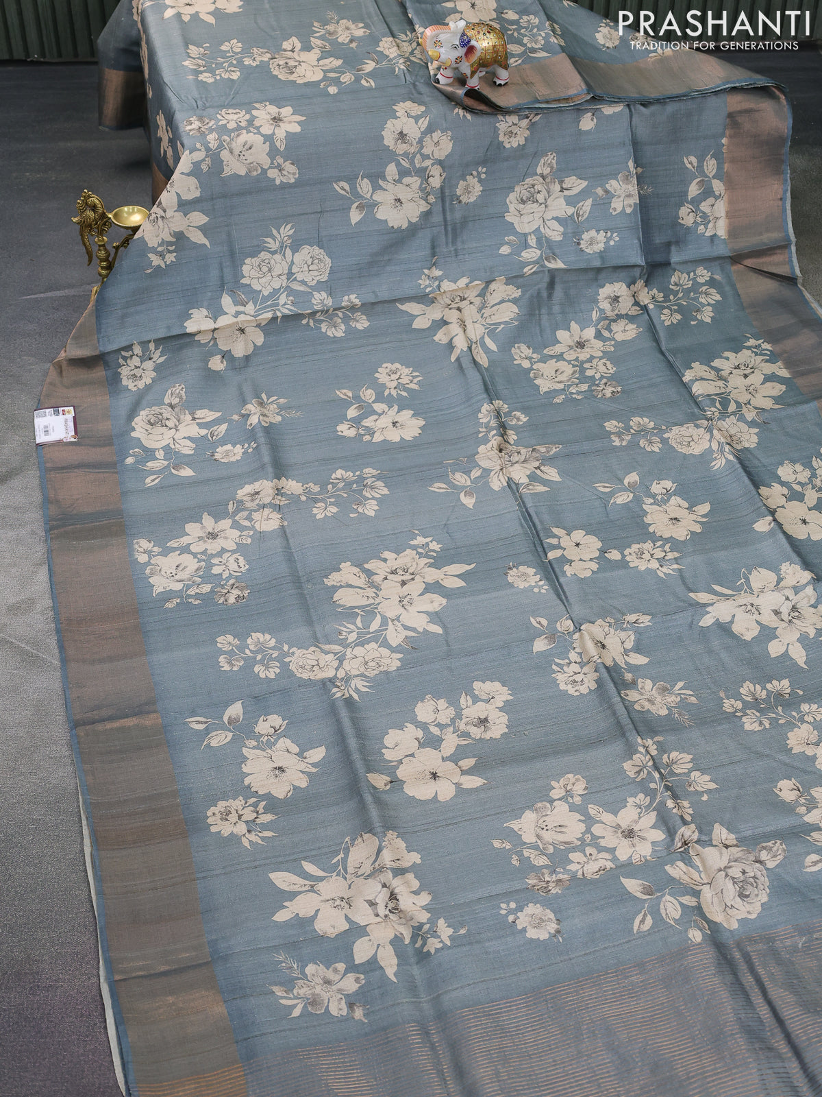 Pure tussar silk saree grey with floral digital prints and zari woven border