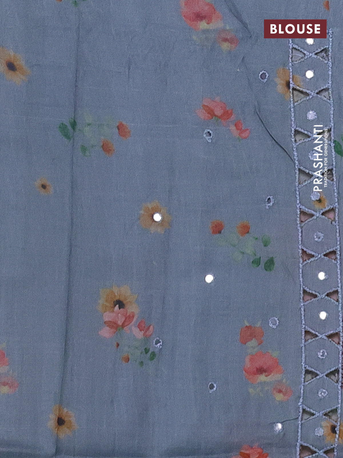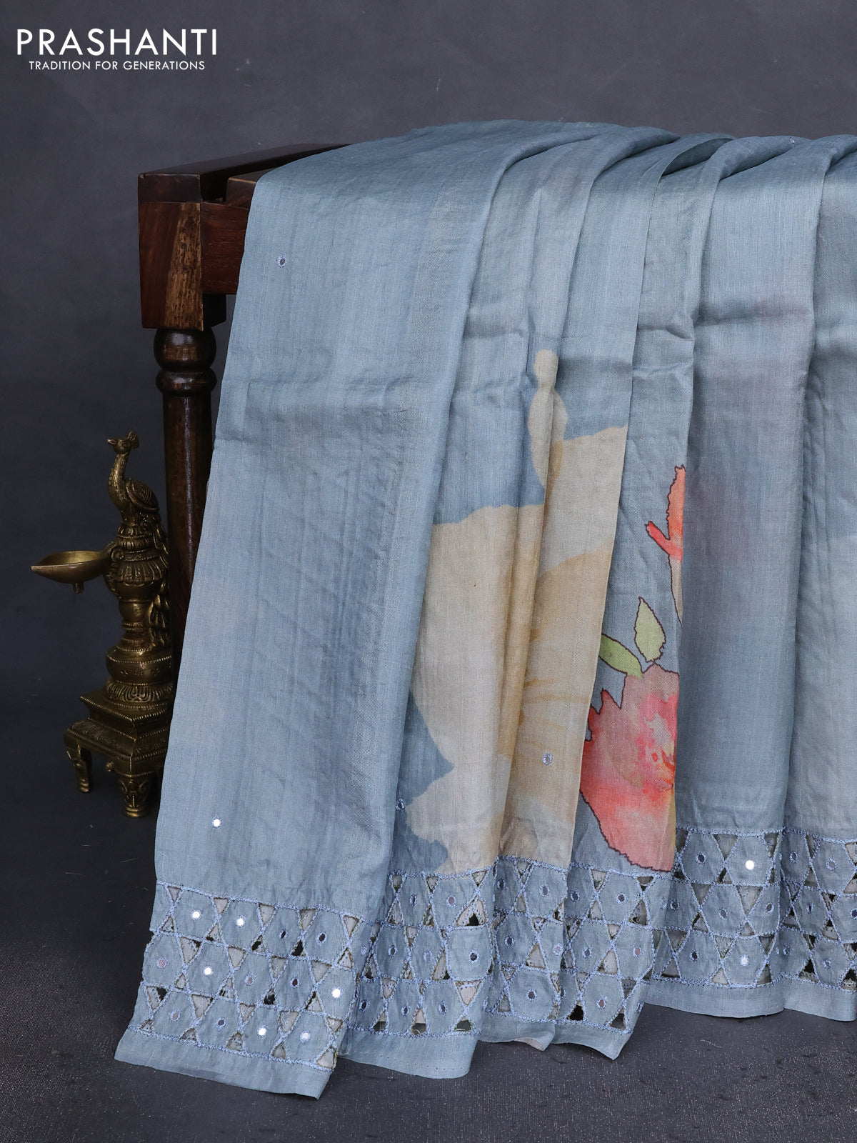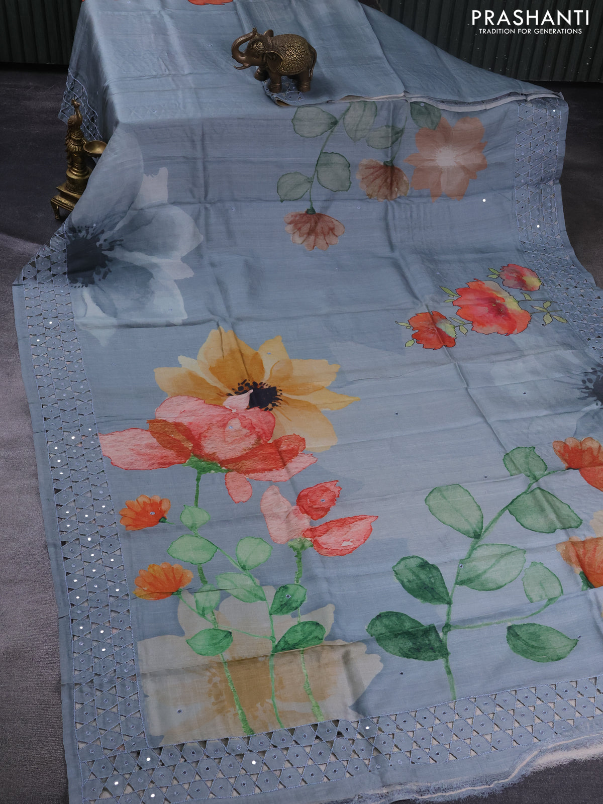 Pure tussar silk saree grey with floral digital prints & mirror work and cut work border