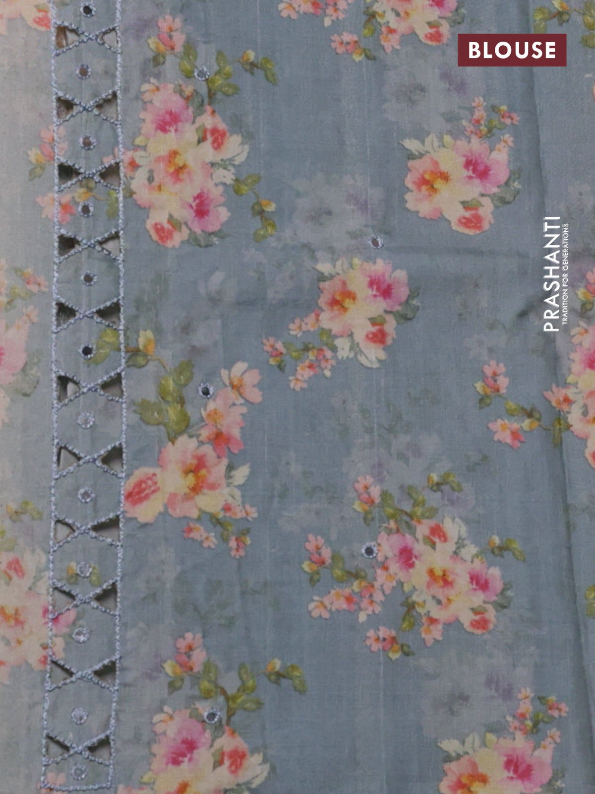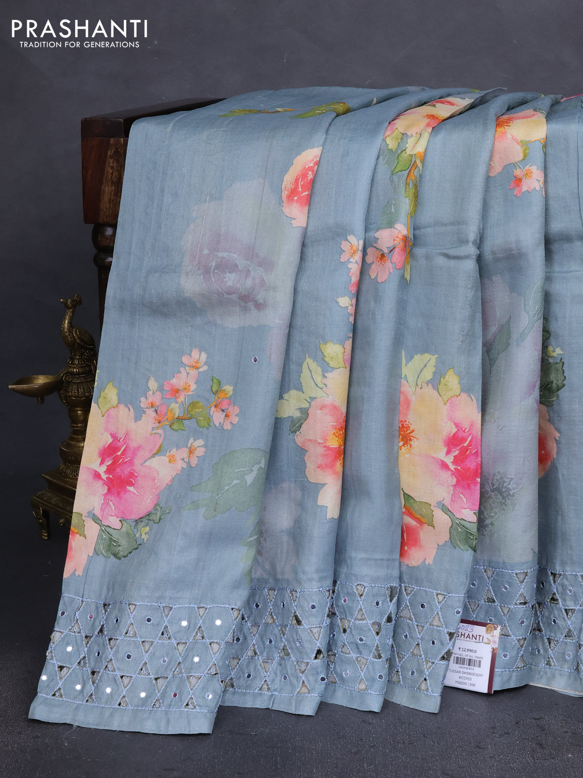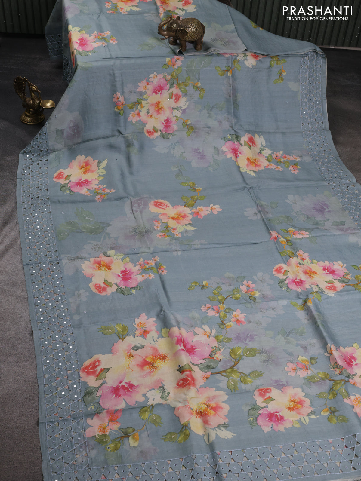 Pure tussar silk saree grey with floral digital prints & mirror work and cut work border