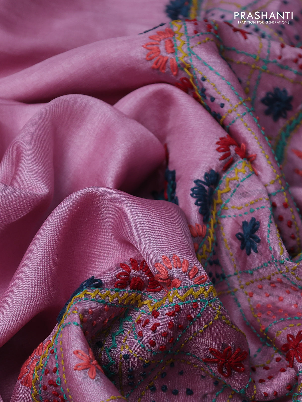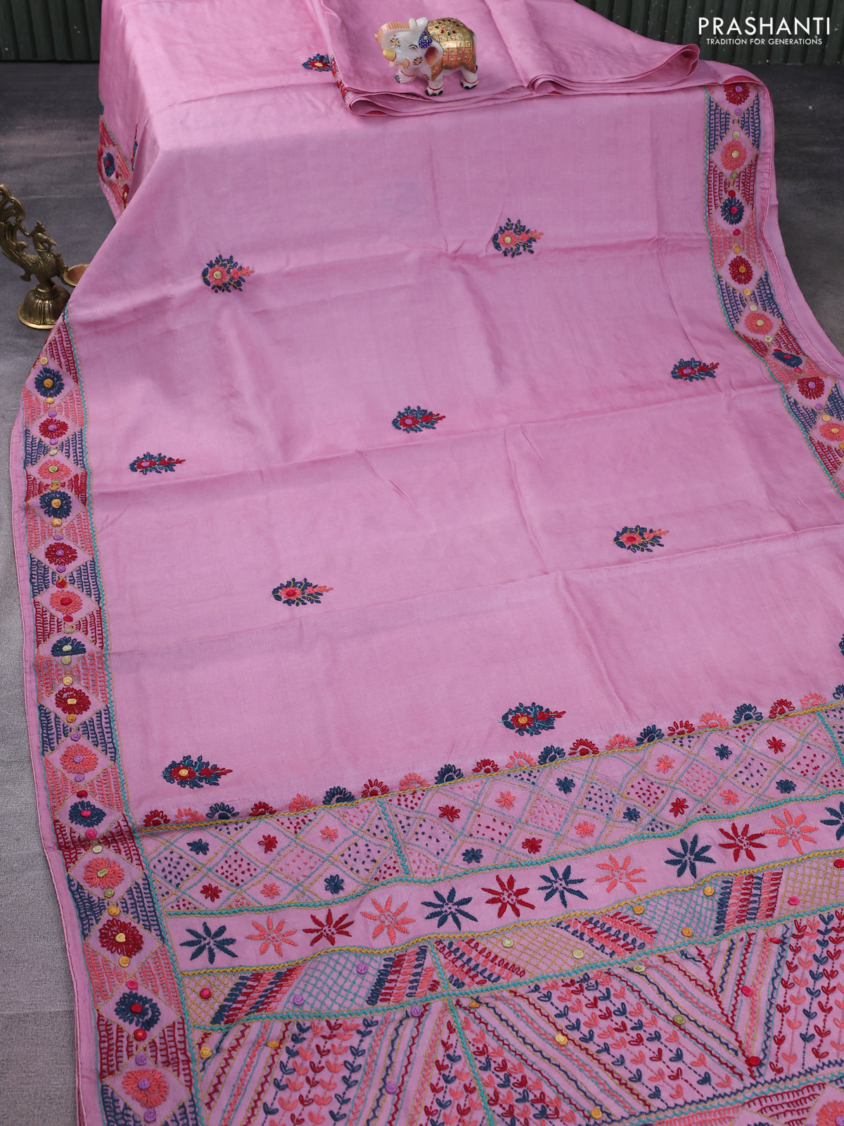 Pure tussar silk saree light pink with embrioidery work buttas and kantha stitch work pallu