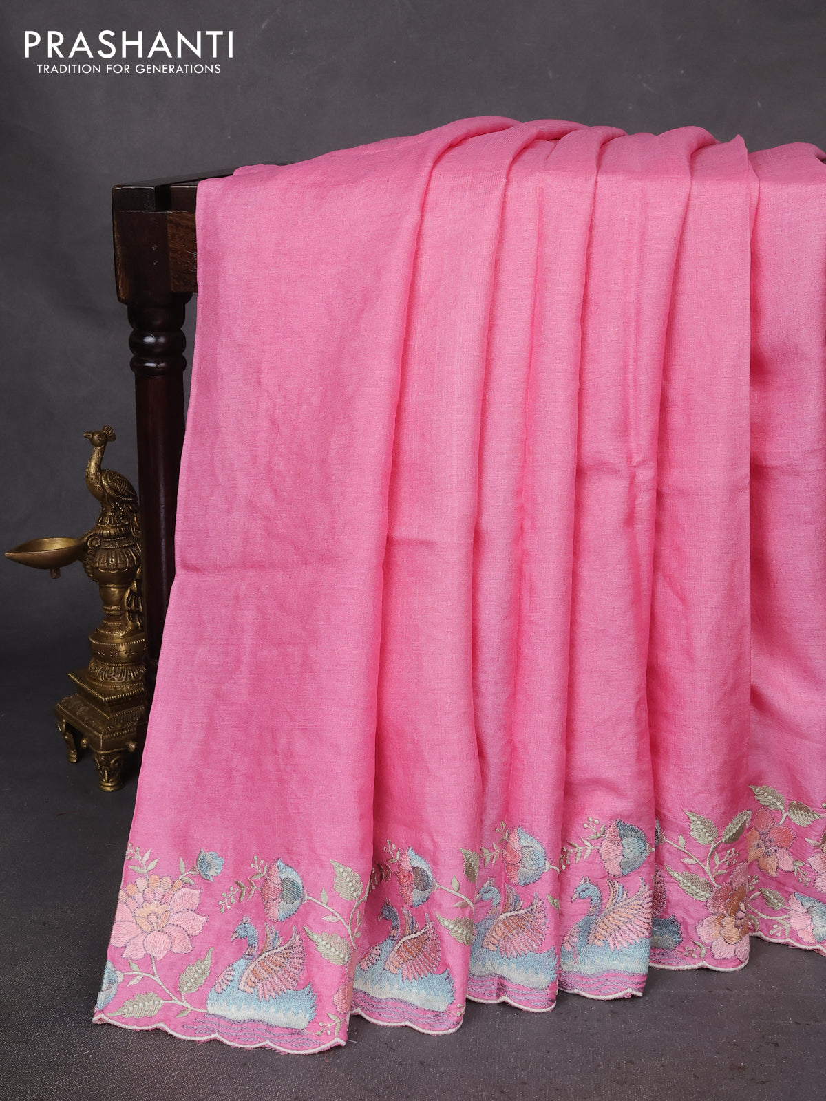 Pure tussar silk saree light pink with plain body and floral design embroidery border