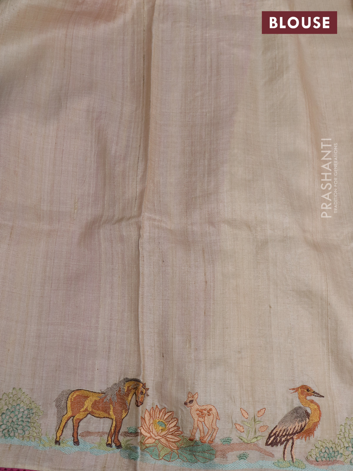 Pure tussar silk saree magenta pink and cream with plain body and embroidery work pallu