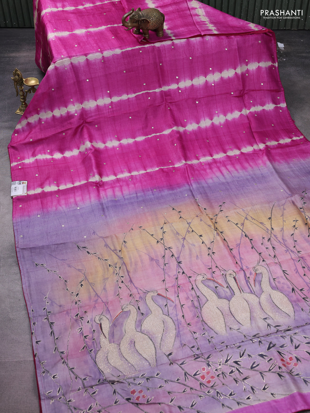 Pure tussar silk saree magenta pink and mild lavender with tie & dye prints and pita work pallu