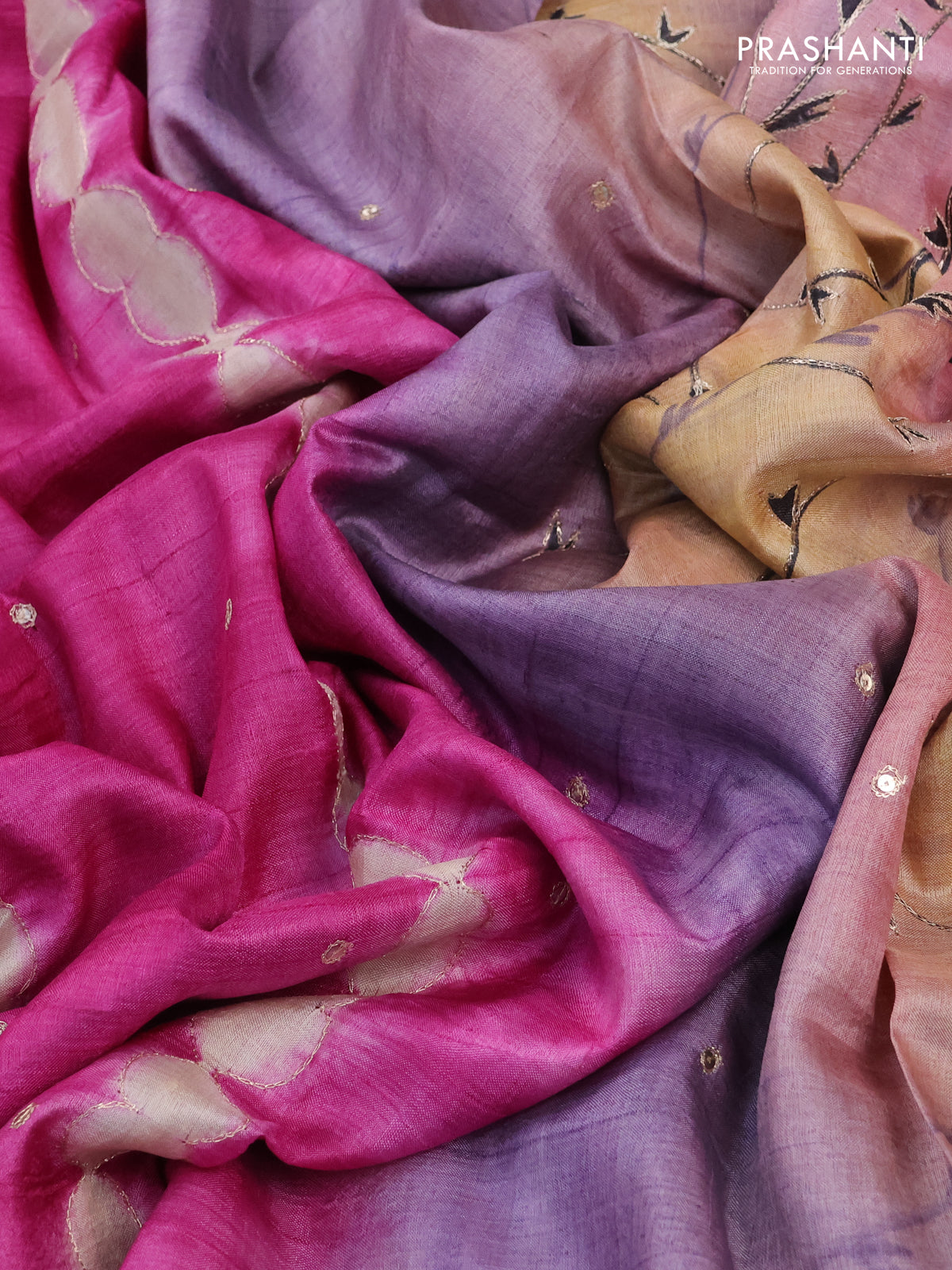 Prashanti’s Pure Tussars bring together rich textures with embroidery, hand-painted details, and contemporary digital prints, crafted for refined occasions.