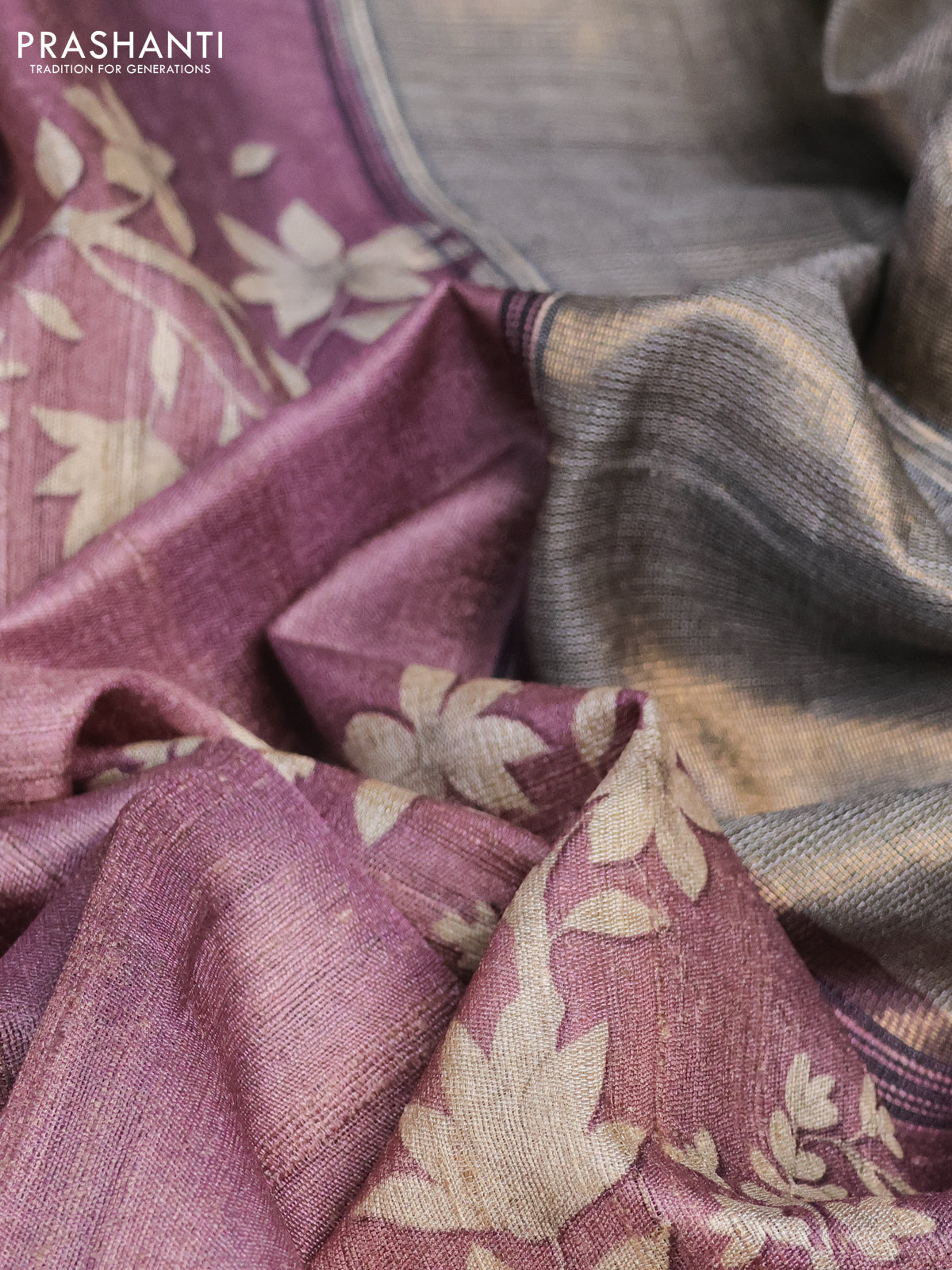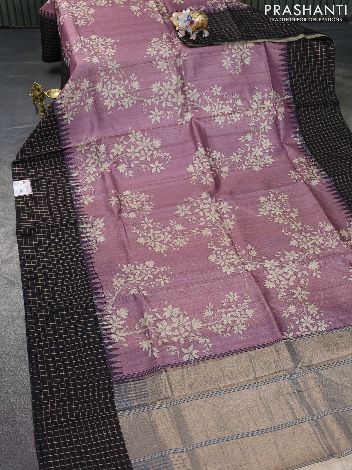 Pure tussar silk saree mauve pink and black with floral digital prints and temple design zari checked border
