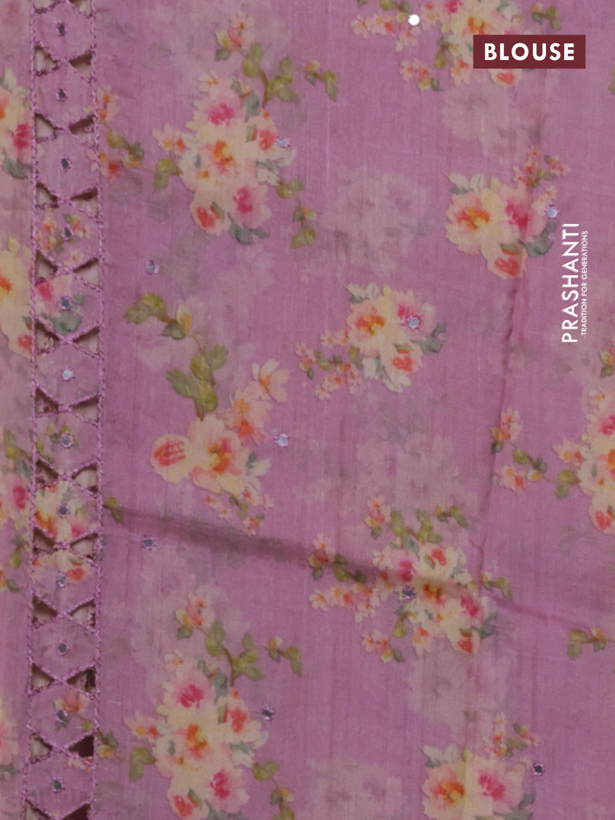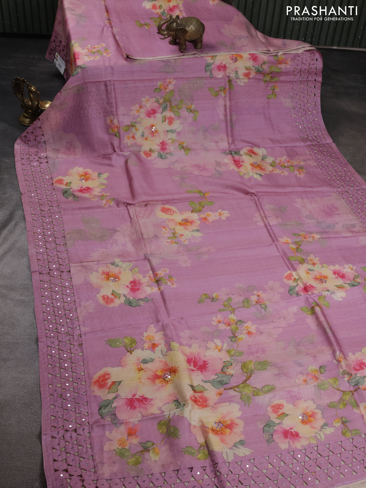 Pure tussar silk saree mauve pink with floral digital prints & mirror work and cut work border
