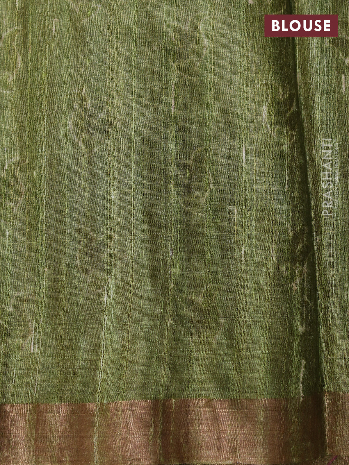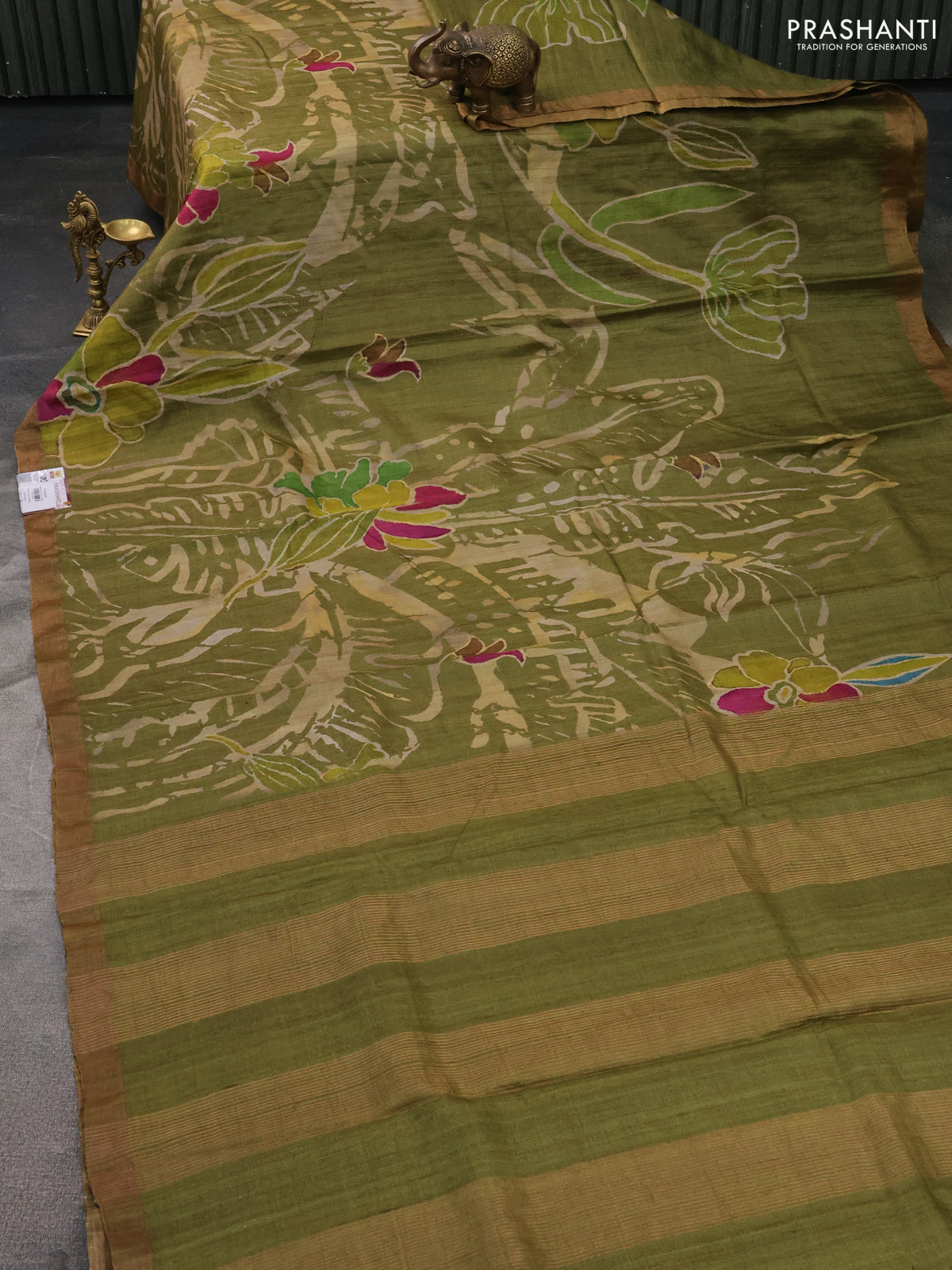 Pure tussar silk saree mehendi green with allover digital prints and zari woven border