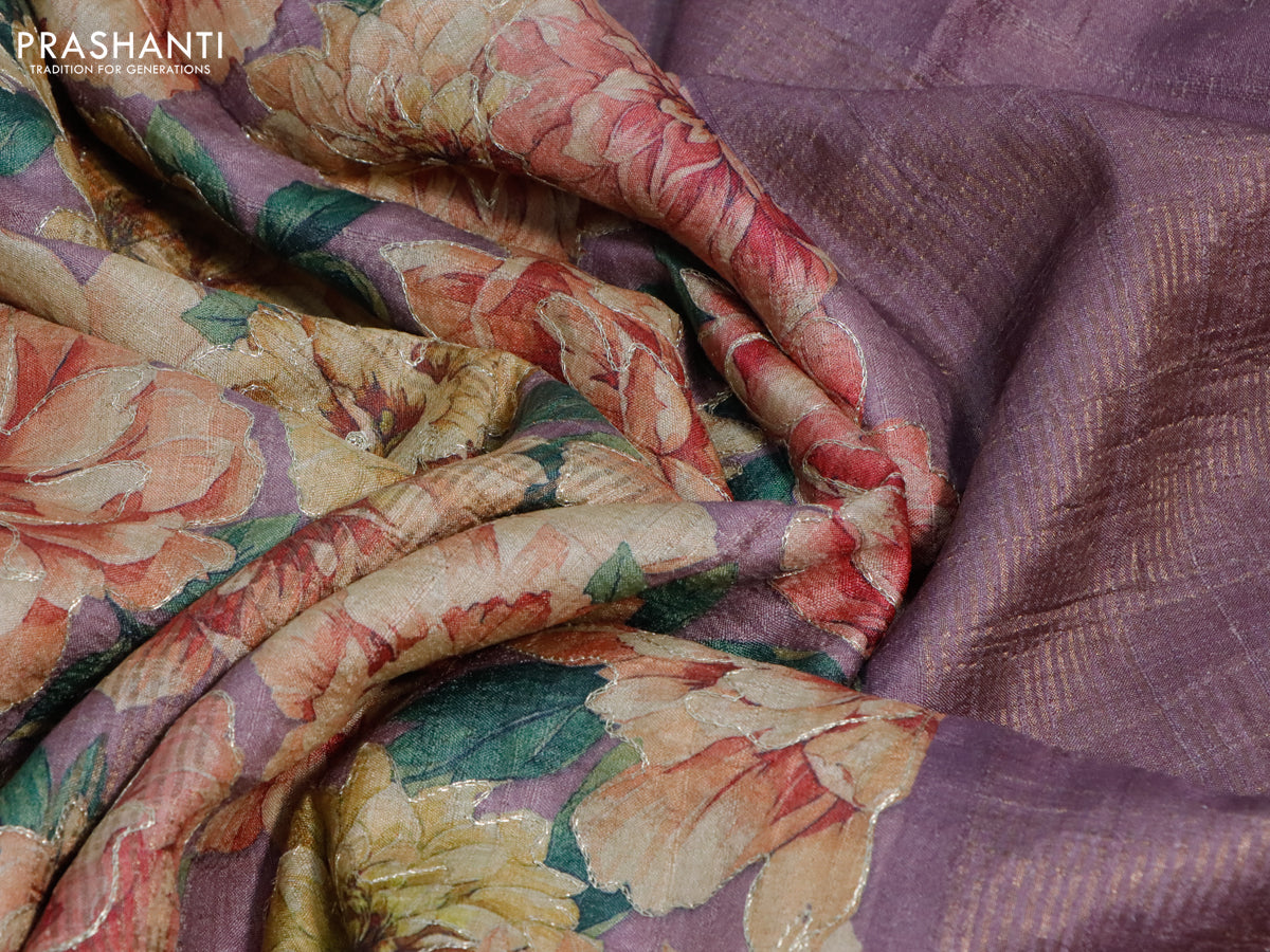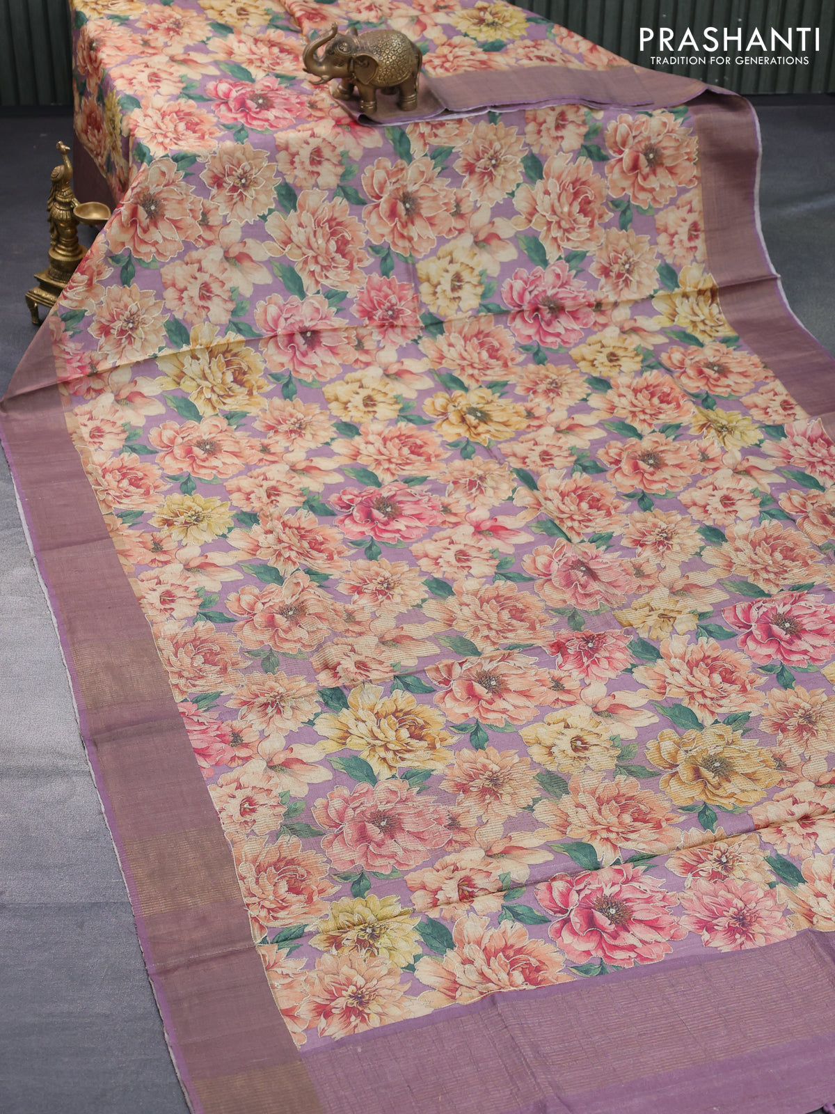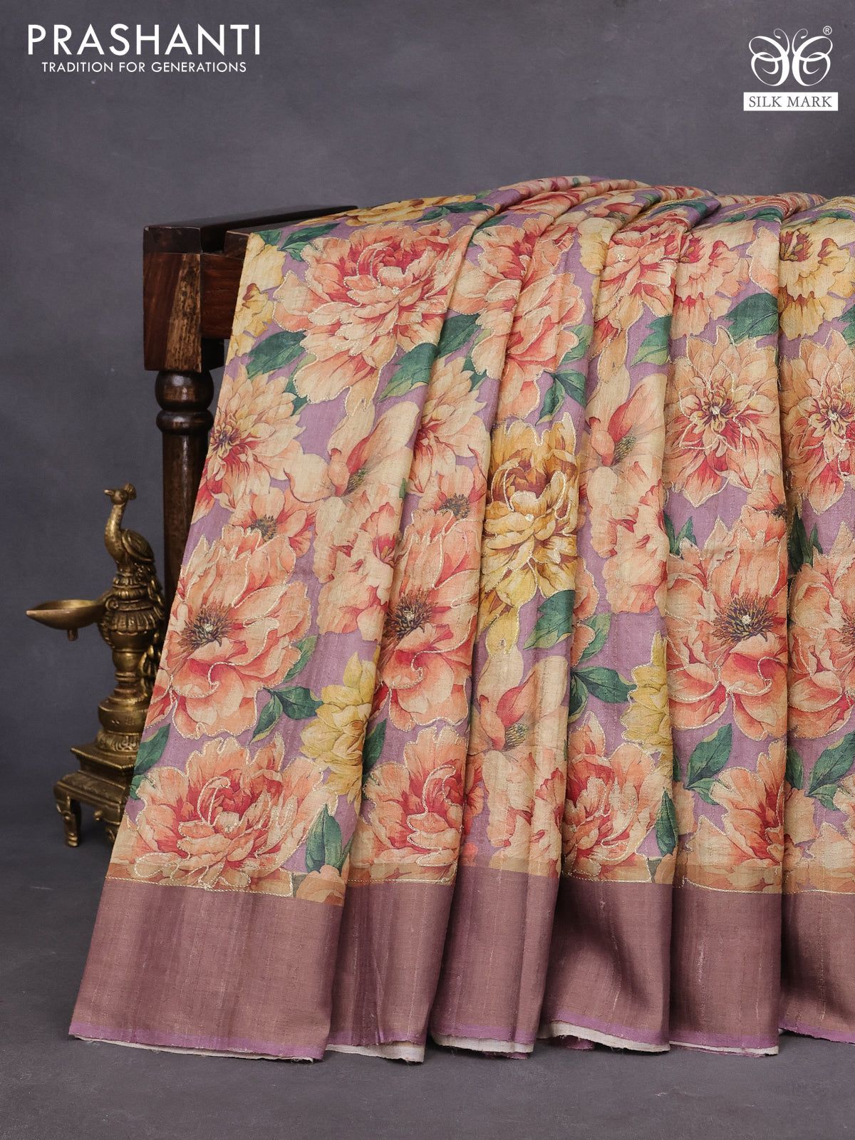 Pure tussar silk saree mild purple with allover floral prints & pita work and zari woven border