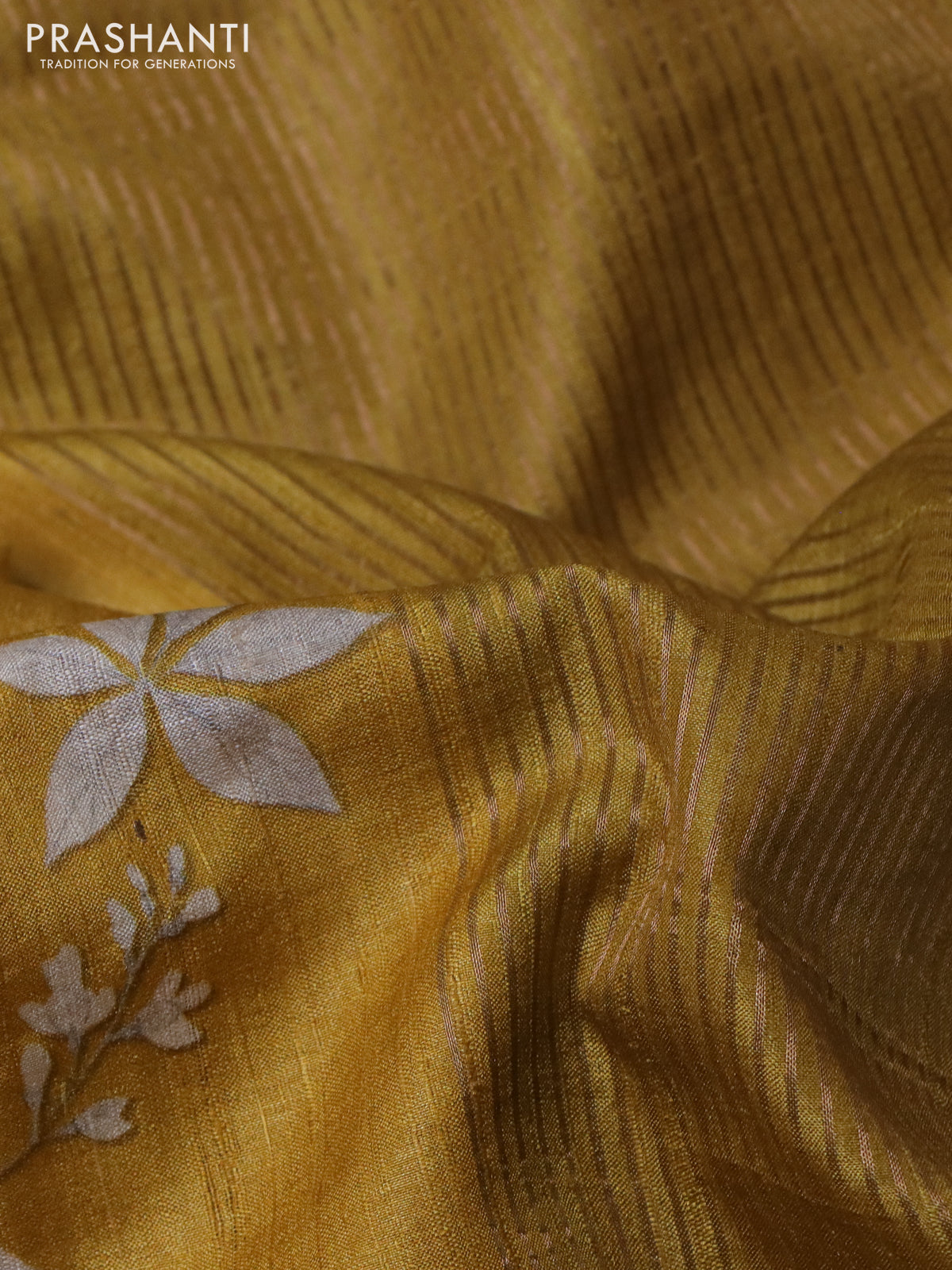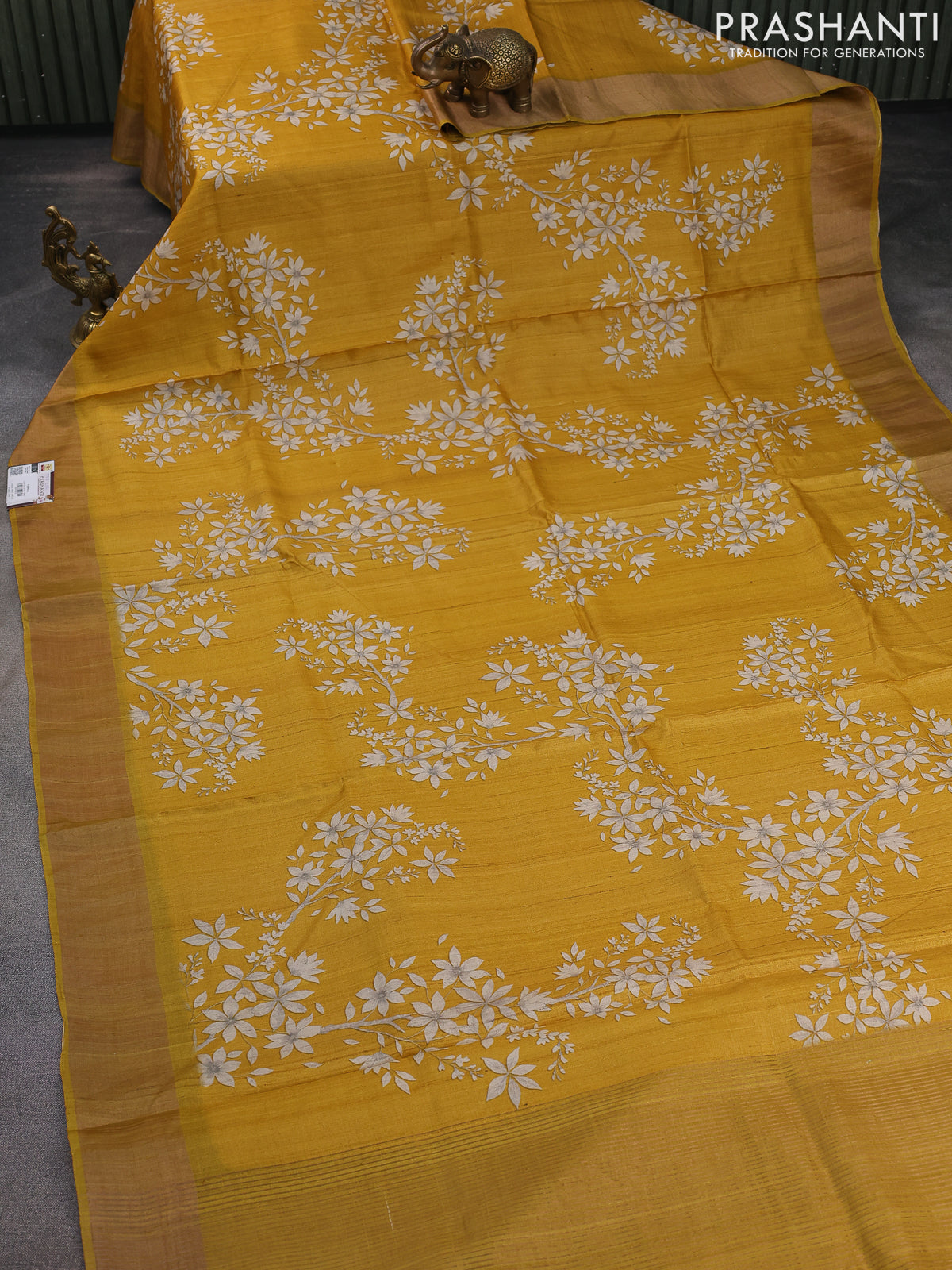 Pure tussar silk saree mustad yellow with allover floral digital prints and zari woven border