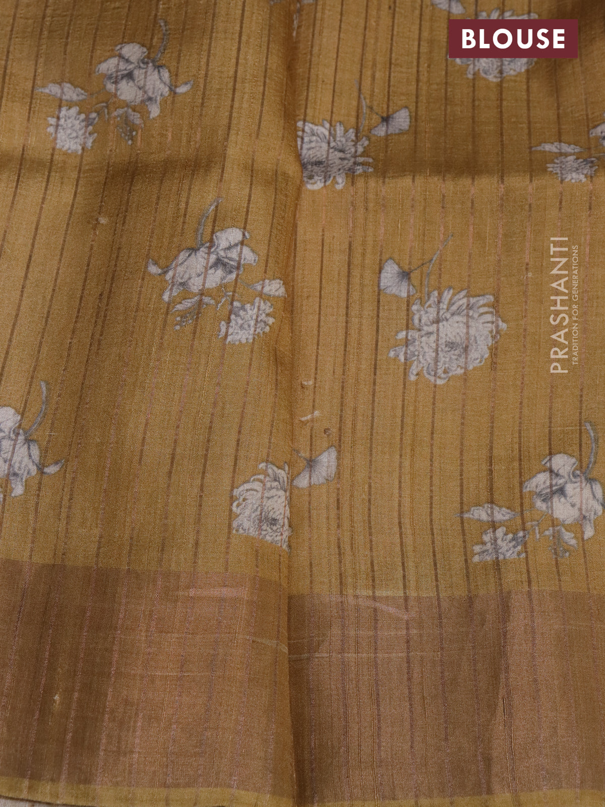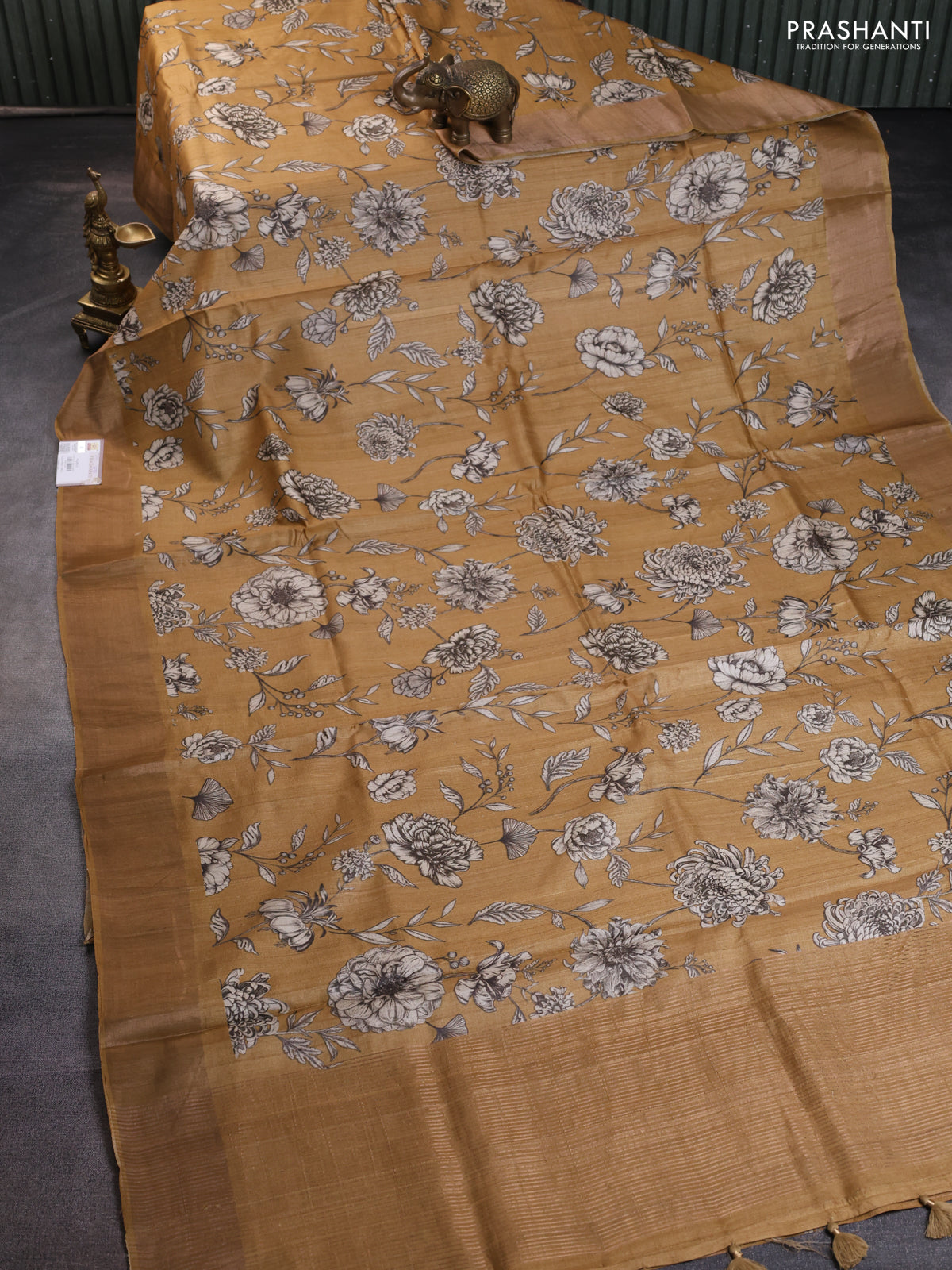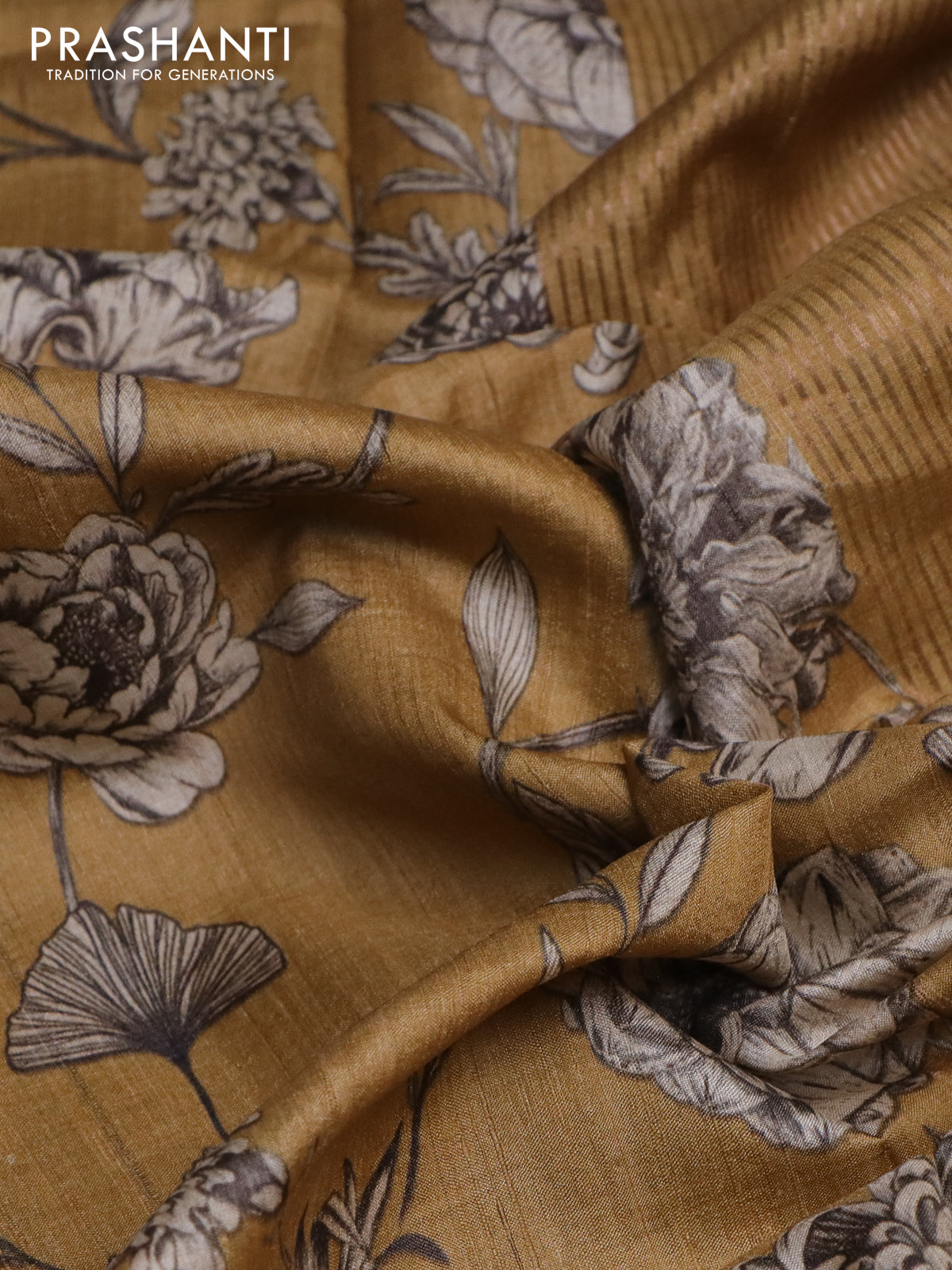 Pure tussar silk saree mustard shade with floral digital prints and zari woven border
